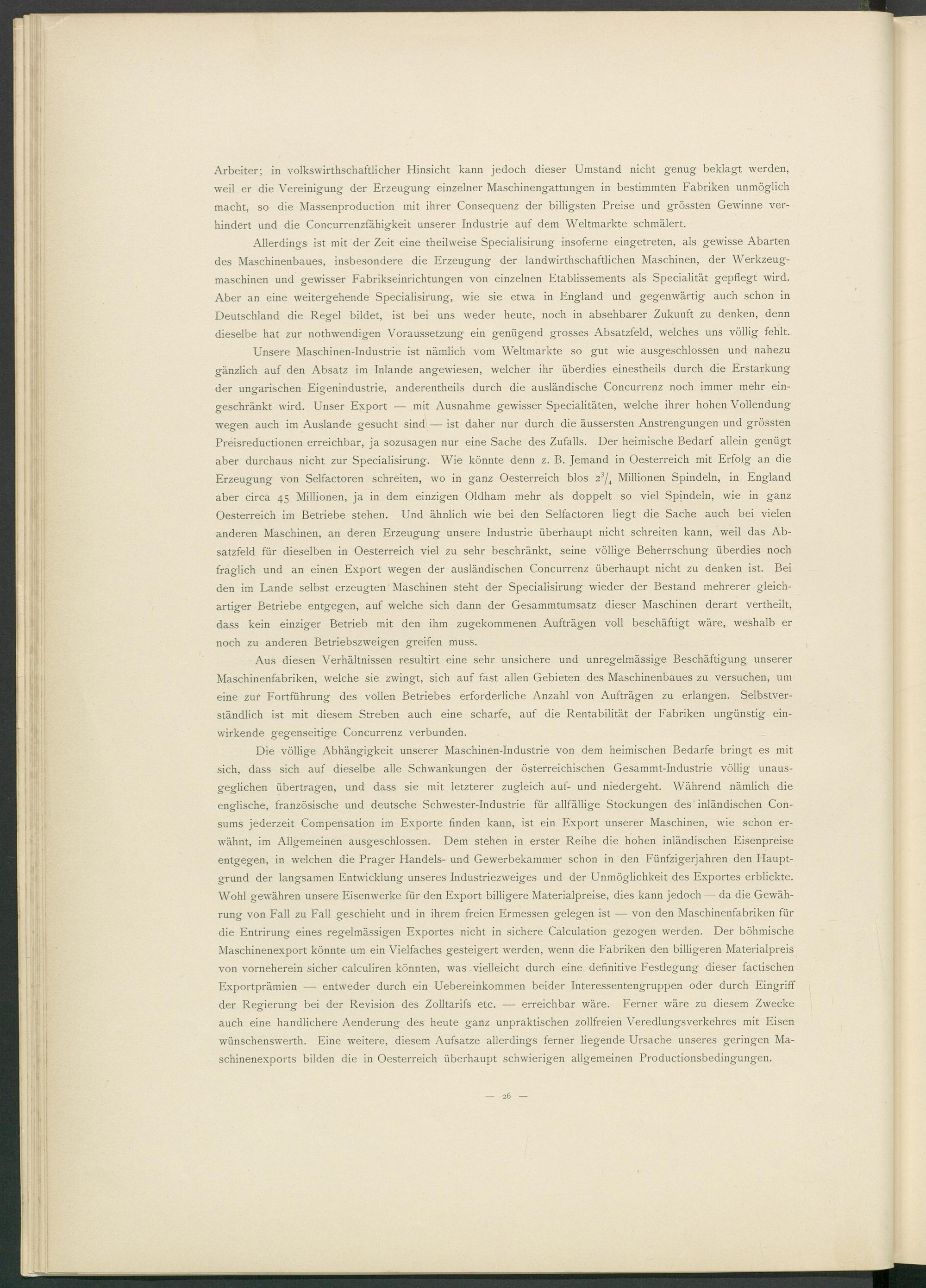 Unsere Maschinen-Industrie ist nämlich vom Weltmärkte so gut wie ausgeschlossen und nahezu gänzlich auf den Absatz im Inlande angewiesen, welcher ihr überdies einesteils durch die Erstarkung der ungarischen Eigenindustrie, anderenteils durch die ausländische Concurrenz noch immer mehr eingeschränkt wird. Unser Export — mit Ausnahme gewisser Specialitäten, welche ihrer hohen Vollendung wegen auch im Auslande gesucht sind — ist daher nur durch die äussersten Anstrengungen und grössten Preisreductionen erreichbar, ja sozusagen nur eine Sache des Zufalls. Der heimische Bedarf allein genügt aber durchaus nicht zur Specialisirung. Wie könnte denn z. B. Jemand in Oesterreich mit Erfolg an die Erzeugung von Selfactoren schreiten, wo in ganz Oesterreich blos 2 J / 4 Millionen Spindeln, in England aber circa 45 Millionen, ja in dem einzigen Oldham mehr als doppelt so viel Spindeln, wie in ganz Oesterreich im Betriebe stehen. Und ähnlich wie bei den Selfactoren liegt die Sache auch bei vielen anderen Maschinen, an deren Erzeugung unsere Industrie überhaupt nicht schreiten kann, weil das Absatzfeld für dieselben in Oesterreich viel zu sehr beschränkt, seine völlige Beherrschung überdies noch fraglich und an einen Export wegen der ausländischen Concurrenz überhaupt nicht zu denken ist. Bei den im Lande selbst erzeugten Maschinen steht der Specialisirung wieder der Bestand mehrerer gleichartiger Betriebe entgegen, auf welche sich dann der Gesammtumsatz dieser Maschinen derart vertheilt, dass kein einziger Betrieb mit den ihm zugekommenen Aufträgen voll beschäftigt wäre, weshalb er noch zu anderen Betriebszweigen greifen muss.