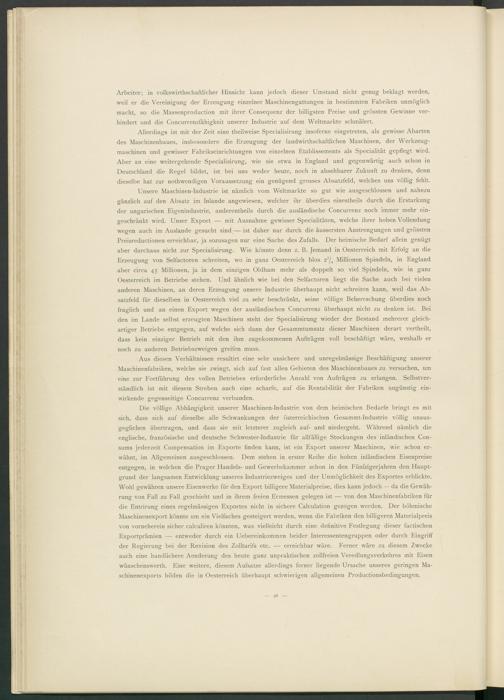 Allerdings ist mit der Zeit eine teilweise Specialisirung insoferne eingetreten, als gewisse Abarten des Maschinenbaues, insbesondere die Erzeugung der landwirtschaftlichen Maschinen, der Werkzeugmaschinen und gewisser Fabrikseinrichtungen von einzelnen Etablissements als Specialität gepflegt wird. Aber an eine weitergehende Specialisirung, wie sie etwa in England und gegenwärtig auch schon in Deutschland die Regel bildet, ist bei uns weder heute, noch in absehbarer Zukunft zu denken, denn dieselbe hat zur notwendigen Voraussetzung' ein genügend grosses Absatzfeld, welches uns völlig fehlt.