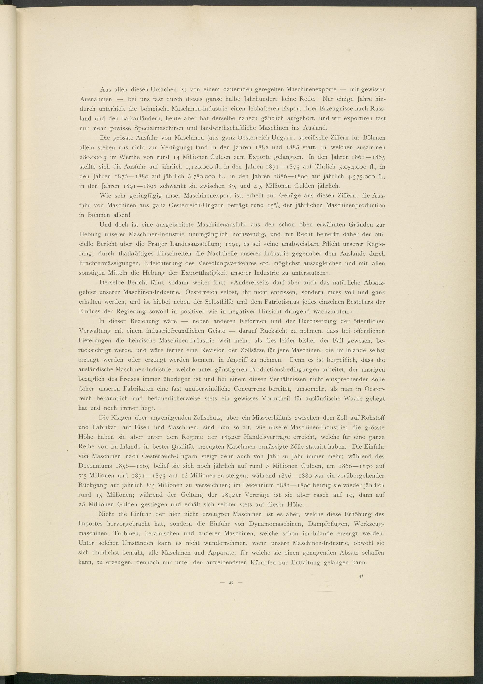Und doch ist eine ausgebreitete Maschinenausfuhr aus den schon oben erwähnten Gründen zur Hebung unserer Maschinen-Industrie unumgänglich notliwendig, und mit Recht bemerkt daher der offi- cielle Bericht über die Prager Landesausstellung 1891, es sei «eine unabweisbare Pflicht unserer Regierung, durch thatkräftiges Einschreiten die Nachtheile unserer Industrie gegenüber dem Auslande durch Frachtermässigungen, Erleichterung des Veredlungsverkehres etc. möglichst auszugleichen und mit allen sonstigen Mitteln die Hebung der Exportthätigkeit unserer Industrie zu unterstützen».