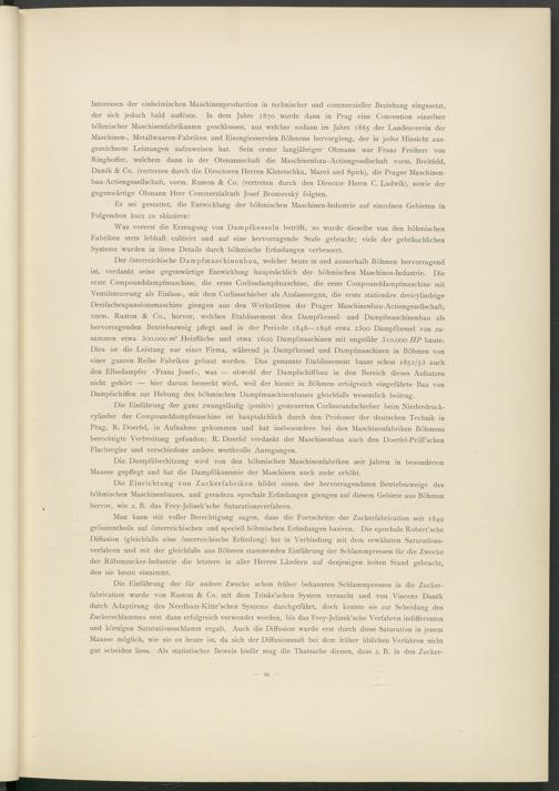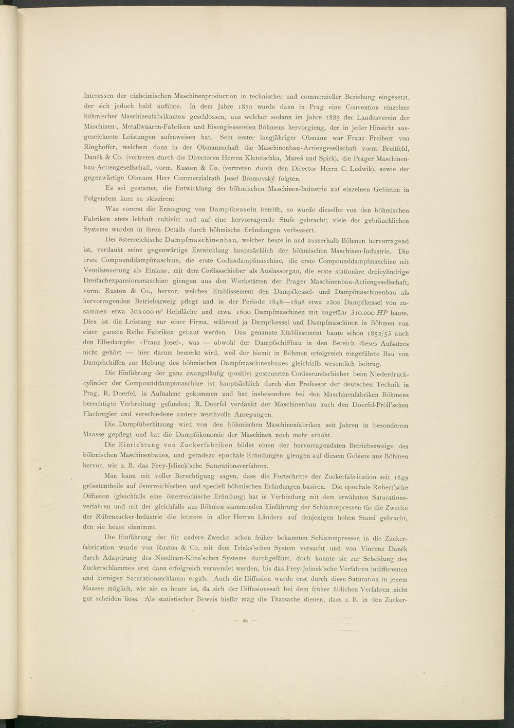 Interessen der einheimischen Maschinenproduction in technischer und commerzieller Beziehung eingesetzt, der sich jedoch bald auflöste. In dem Jahre 1870 wurde dann in Prag eine Convention einzelner böhmischer Maschinenfabrikanten geschlossen, aus welcher sodann im Jahre 1885 der Landesverein der Maschinen-, Metallwaaren-Fabriken und Eisengiessereien Böhmens hervorgieng, der in jeder Hinsicht ausgezeichnete Leistungen aufzuweisen hat. Sein erster langjähriger Obmann war Franz Freiherr von Ringhoffer, welchem dann in der Obmannschaft die Maschinenbau-Actiengesellschaft vorm. Breitfeld, Danek & Co. (vertreten durch die Directoren Herren Kletetschka, Mares und Spirk), die Prager Maschinen- bau-Actiengesellschaft, vorm. Ruston & Co. (vertreten durch den Director Herrn C. Ludwik), sowie der gegenwärtige Obmann Herr Commerzialrath Josef Bromovsky folgten.