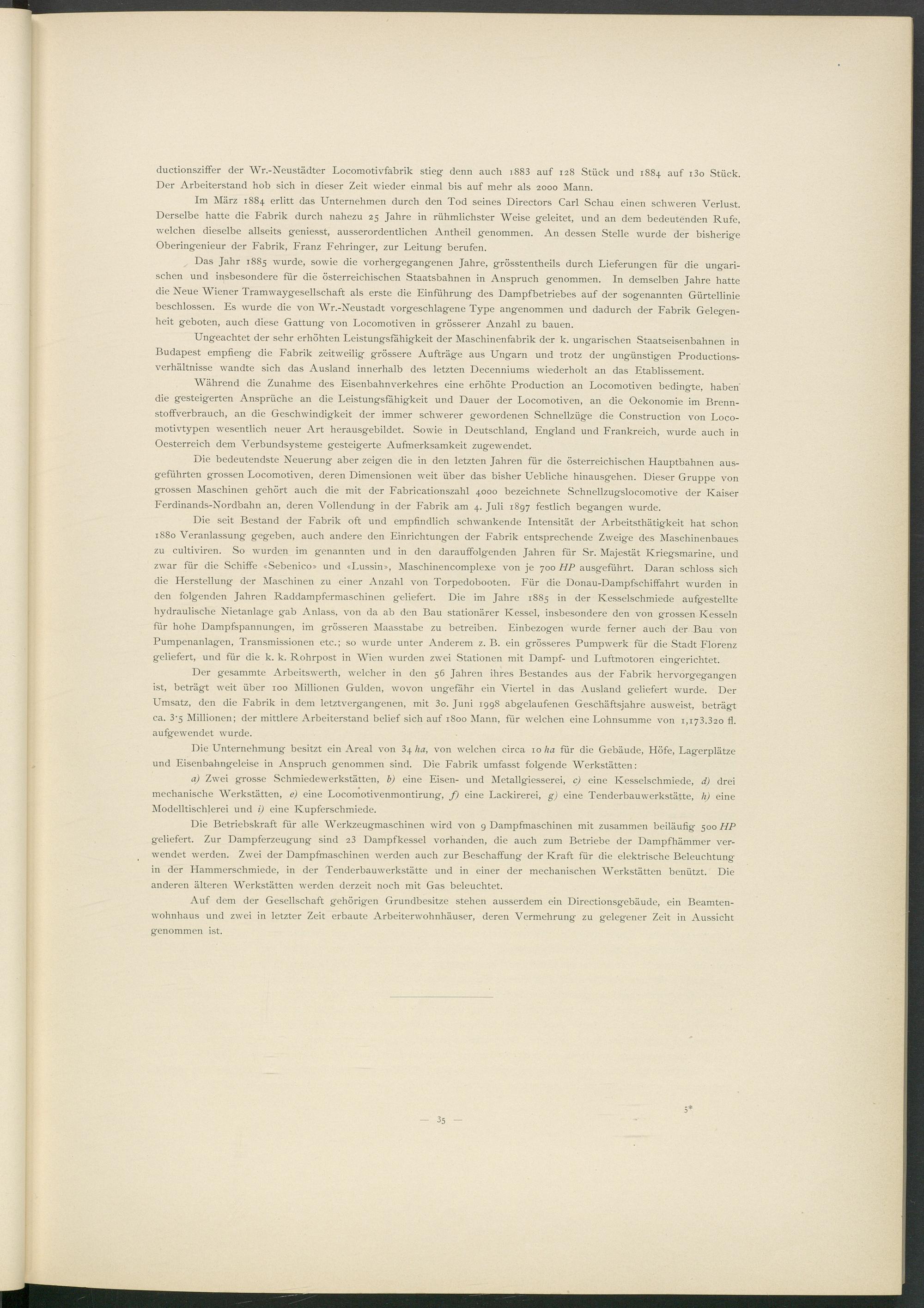 Das Jahr 1885 wurde, sowie die vorhergegangenen Jahre, grösstentheils durch Lieferungen für die ungarischen und insbesondere für die österreichischen Staatsbahnen in Anspruch genommen. In demselben Jahre hatte die Neue Wiener Tramwaygesellschaft als erste die Einführung des Dampfbetriebes auf der sogenannten Gürtellinie beschlossen. Es wurde die von Wr.-Neustadt vorgeschlagene Type angenommen und dadurch der Fabrik Gelegenheit geboten, auch diese Gattung von Locomotiven in grösserer Anzahl zu bauen.
