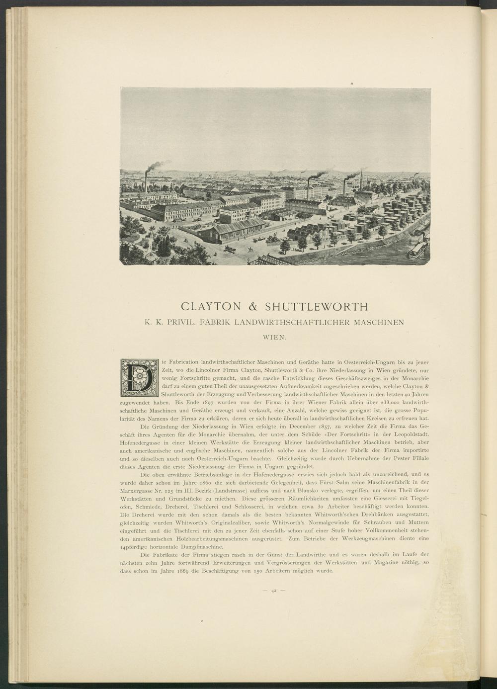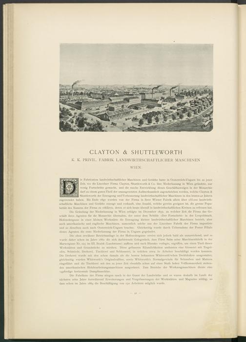 ie Fabrication landwirthschaftlicher Maschinen und Geräthe hatte in Oesterreich-Ungarn bis zu jener Zeit, wo die Lincolner Firma Clayton, Shuttleworth & Co. ihre Niederlassung in Wien gründete, nur wenig Fortschritte gemacht, und die rasche Entwicklung dieses Geschäftszweiges in der Monarchie darf zu einem guten Theil der unausgesetzten Aufmerksamkeit zugeschrieben werden, welche Clayton & Shuttleworth der Erzeugung und Verbesserung landwirthschaftlicher Maschinen in den letzten 40 Jahren zugewendet haben. Bis Ende 1897 wurden von der Firma in ihrer Wiener Fabrik allein über 233.000 landwirtschaftliche Maschinen und Geräthe erzeugt und verkauft, eine Anzahl, welche gewiss geeignet ist, die grosse Popularität des Namens der Firma zu erklären, deren er sich heute überall in landwirthschaftlichen Kreisen zu erfreuen hat.