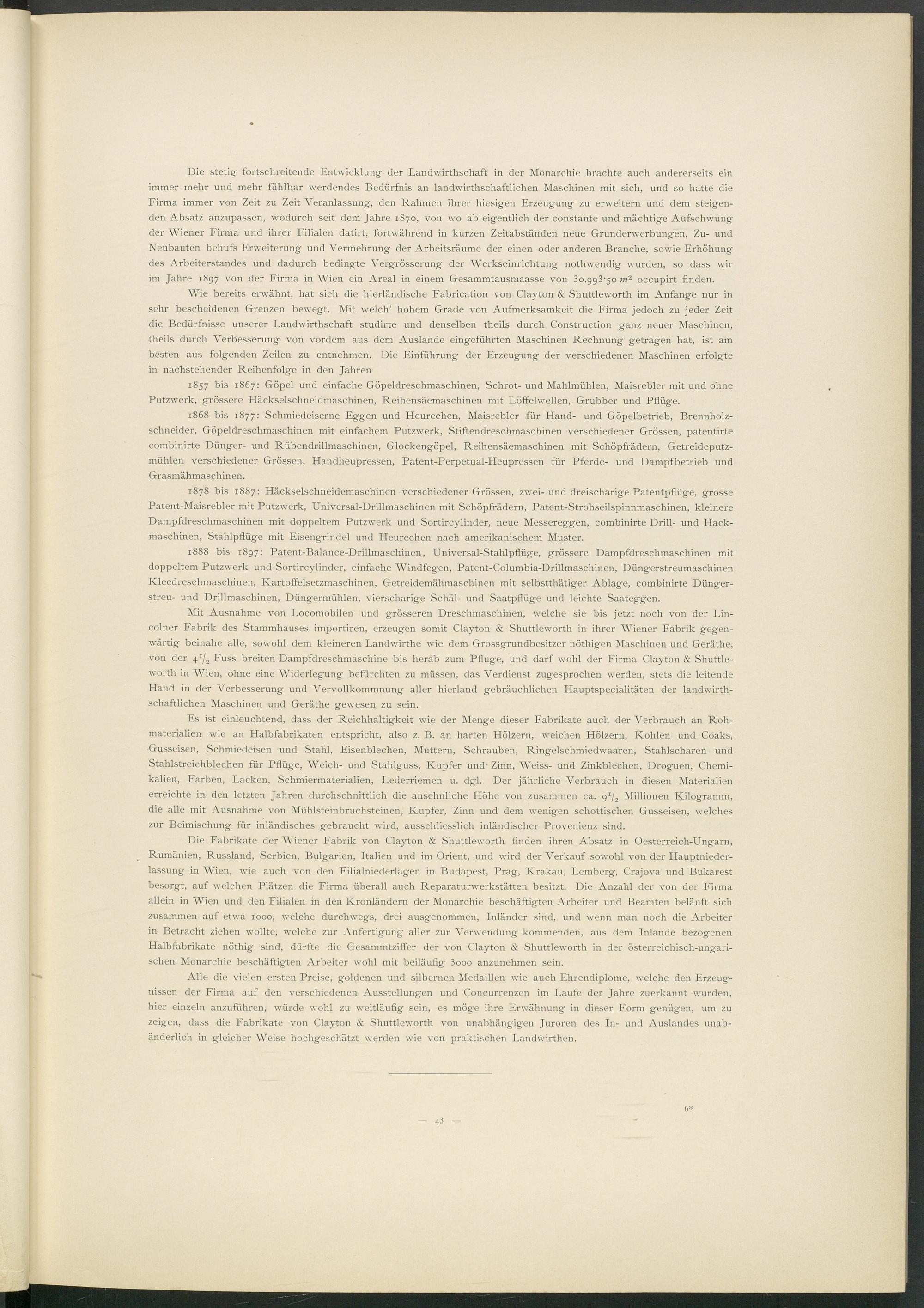 Die stetig fortschreitende Entwicklung der Landwirtschaft in der Monarchie brachte auch andererseits ein immer mehr und mehr fühlbar werdendes Bedürfnis an landwirtschaftlichen Maschinen mit sich, und so hatte die Firma immer von Zeit zu Zeit Veranlassung, den Rahmen ihrer hiesigen Erzeugung zu erweitern und dem steigenden Absatz anzupassen, wodurch seit dem Jahre 1870, von wo ab eigentlich der constante und mächtige Aufschwung der Wiener Firma und ihrer Filialen datirt, fortwährend in kurzen Zeitabständen neue Grunderwerbungen, Zu- und Neubauten behufs Erweiterung und Vermehrung der Arbeitsräume der einen oder anderen Branche, sowie Erhöhung des Arbeiterstandes und dadurch bedingte Vergrösserung der Werkseinrichtung notwendig wurden, so dass wir im Jahre 1897 von der Firma in Wien ein Areal in einem Gesammtausmaasse von 3o.gg3'5o m 2 occupirt finden.