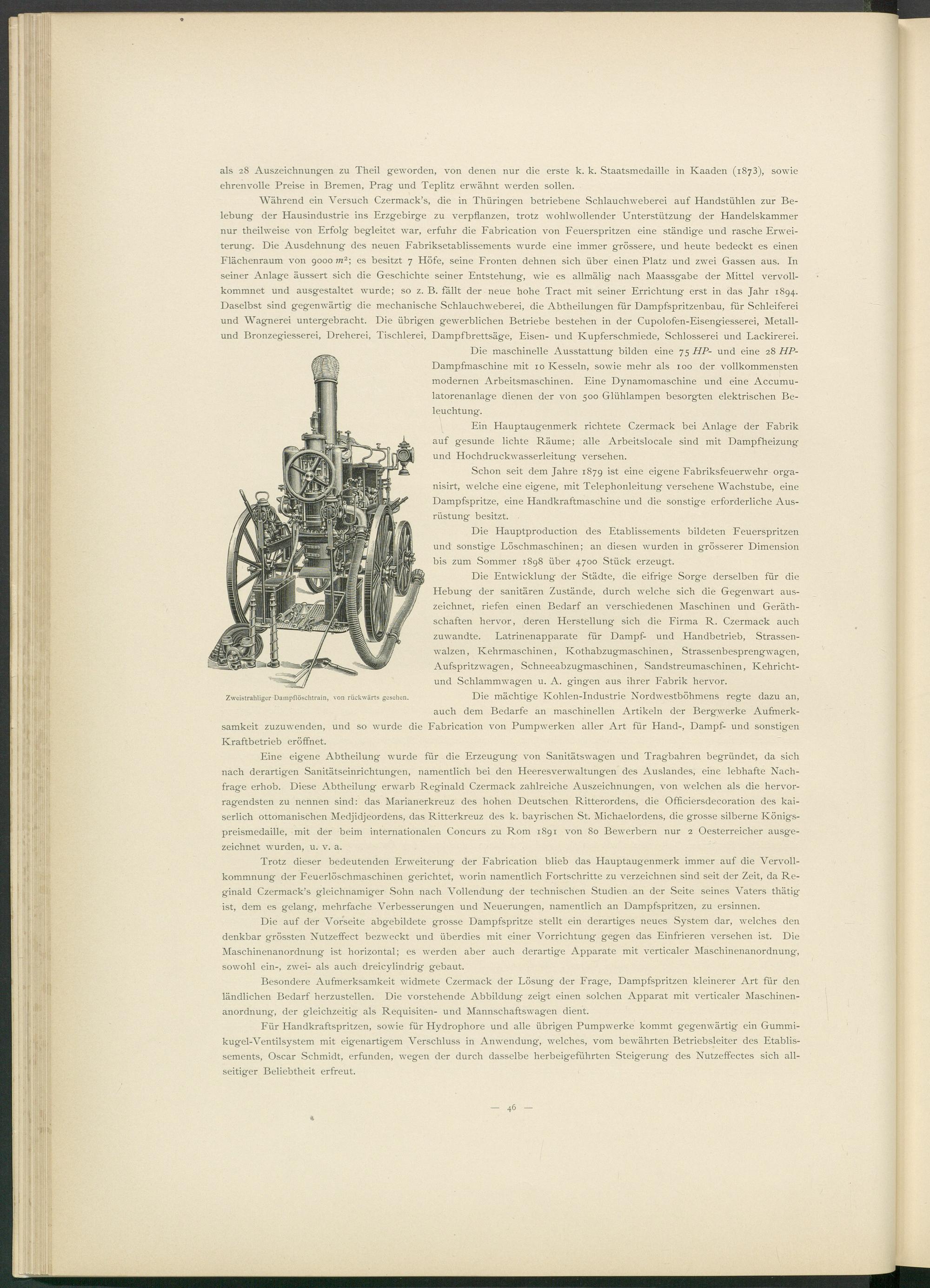 Trotz dieser bedeutenden Erweiterung der Fabrication blieb das Hauptaugenmerk immer auf die Vervollkommnung der Feuerlöschmaschinen gerichtet, worin namentlich Fortschritte zu verzeichnen sind seit der Zeit, da Reginald Czermack’s gleichnamiger Sohn nach Vollendung der technischen Studien an der Seite seines Vaters thätig ist, dem es gelang, mehrfache Verbesserungen und Neuerungen, namentlich an Dampfspritzen, zu ersinnen.
