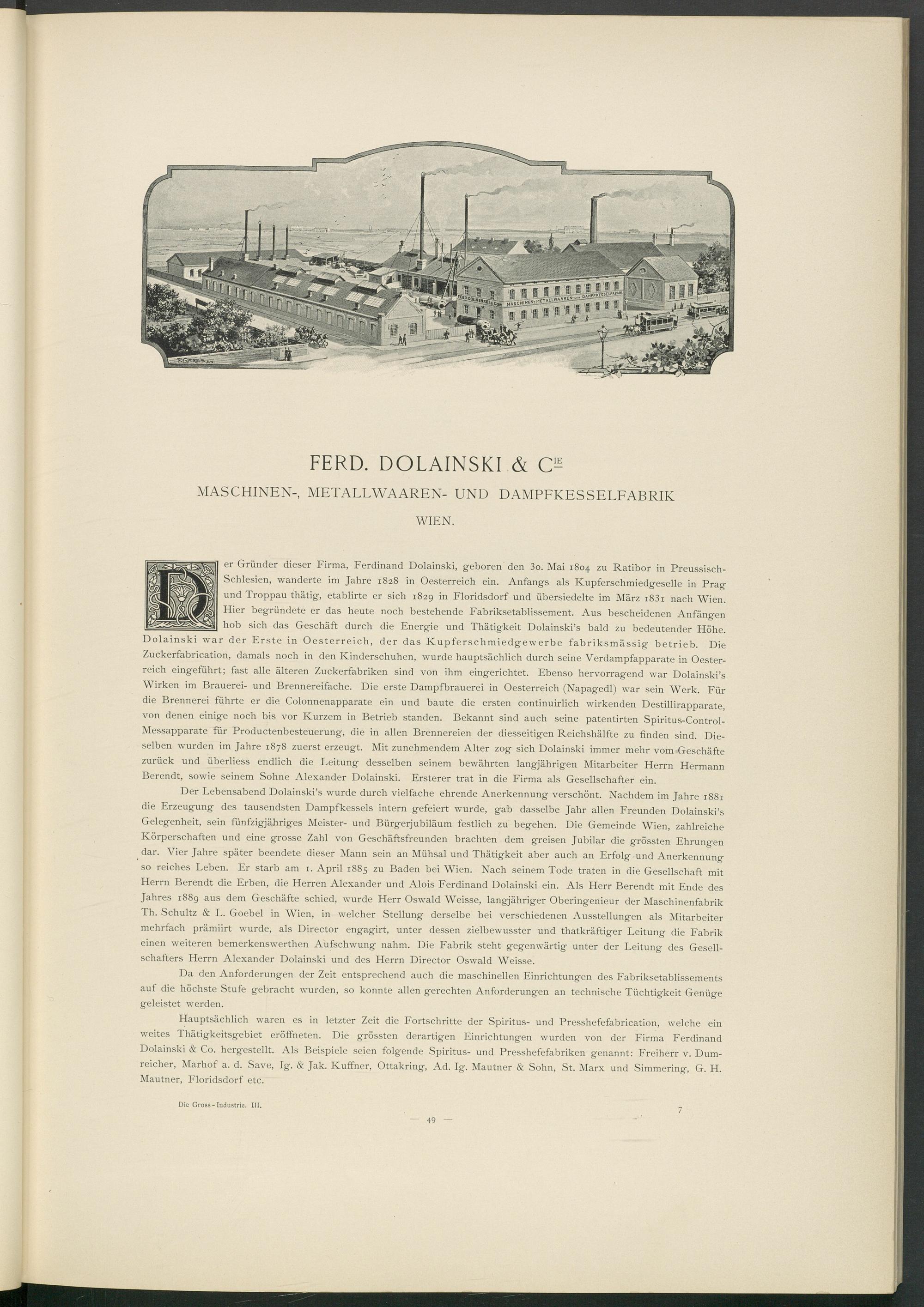 er Gründer dieser Firma, Ferdinand Dolainski, geboren den 3o. Mai 1804 zu Ratibor in Preussisch- Schlesien, wanderte im Jahre 1828 in Oesterreich ein. Anfangs als Kupferschmiedgeselle in Prag und Troppau thätig, etablirte er sich 182g in Floridsdorf und übersiedelte im März i 83 i nach Wien. Hier begründete er das heute noch bestehende Fabriksetablissement. Aus bescheidenen Anfängen hob sich das Geschäft durch die Energie und Thätigkeit Dolainski’s bald zu bedeutender Höhe. Dolainski war der Erste in Oesterreich, der das Kupferschmiedgewerbe fabriksmässig betrieb. Die Zuckerfabrication, damals noch in den Kinderschuhen, wurde hauptsächlich durch seine Verdampfapparate in Oesterreich eingeführt; fast alle älteren Zuckerfabriken sind von ihm eingerichtet. Ebenso hervorragend war Dolainski’s Wirken im Brauerei- und Brennereifache. Die erste Dampfbrauerei in Oesterreich (Napagedl) war sein Werk. Für die Brennerei führte er die Colonnenapparate ein und baute die ersten continuirlich wirkenden Destillirapparate, von denen einige noch bis vor Kurzem in Betrieb standen. Bekannt sind auch seine patentirten Spiritus-Control- Messapparate für Productenbesteuerung, die in allen Brennereien der diesseitigen Reichshälfte zu finden sind. Dieselben wurden im Jahre 1878 zuerst erzeugt. Mit zunehmendem Alter zog sich Dolainski immer mehr vom Geschäfte zurück und überliess endlich die Leitung desselben seinem bewährten langjährigen Mitarbeiter Herrn Hermann Berendt, sowie seinem Sohne Alexander Dolainski. Ersterer trat in die Firma als Gesellschafter ein.