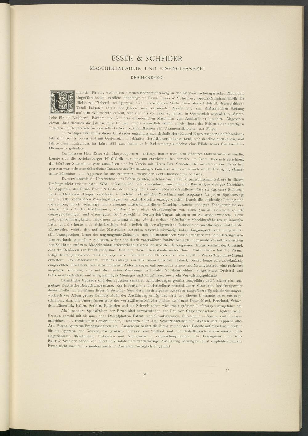 In richtiger Erkenntnis dieses Umstandes entschloss sich deshalb Herr Eduard Esser, welcher eine Maschinenfabrik in Görlitz besass und mit Oesterreich in lebhafter Geschäftsverbindung stand, sich daselbst anzusiedeln, und führte diesen Entschluss im Jahre i883 aus, indem er in Reichenberg zunächst eine Filiale seines Görlitzer Etablissements gründete.