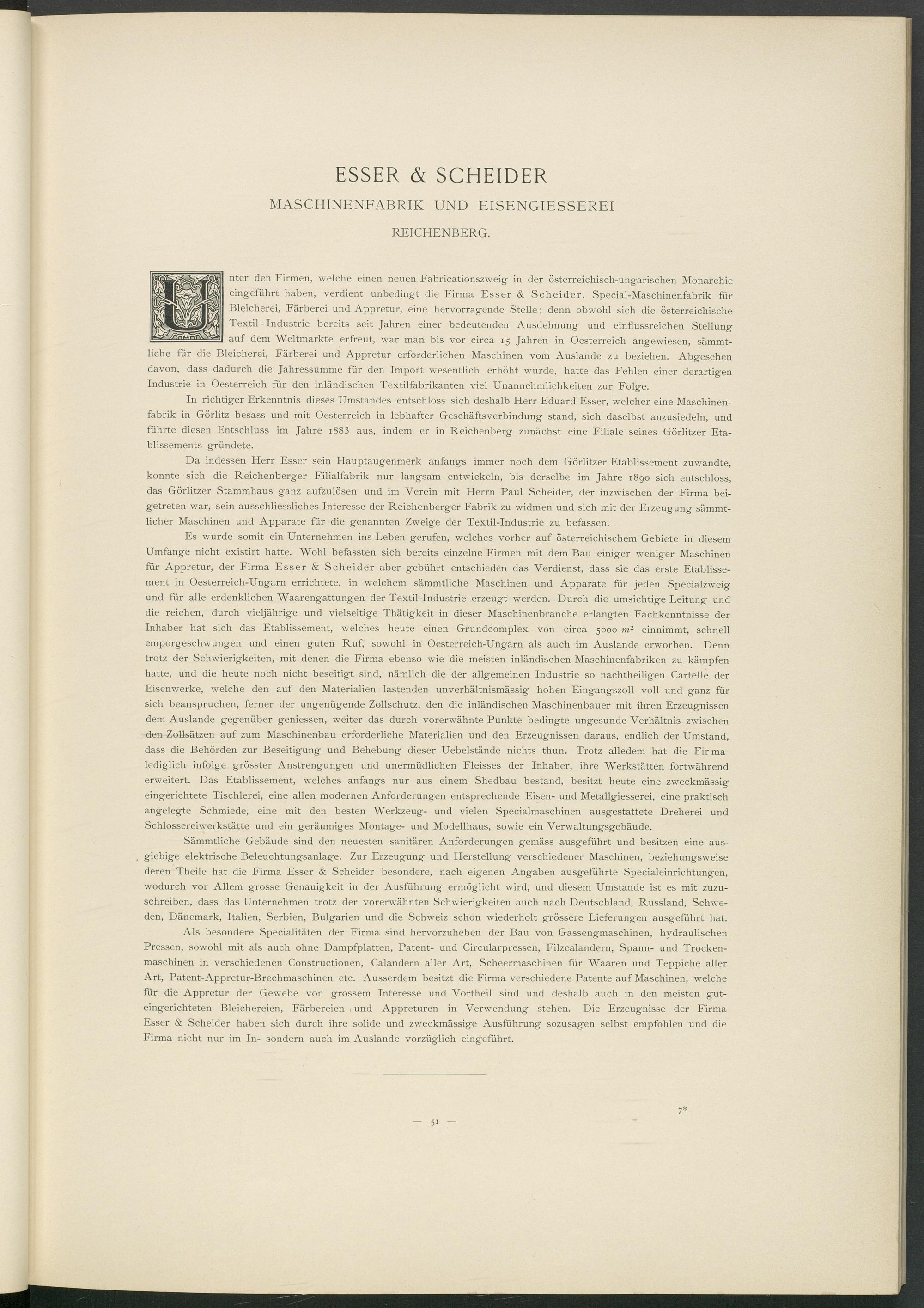 Es wurde somit ein Unternehmen ins Leben gerufen, welches vorher auf österreichischem Gebiete in diesem Umfange nicht existirt hatte. Wohl befassten sich bereits einzelne Firmen mit dem Bau einiger weniger Maschinen für Appretur, der Firma Esser & Scheider aber gebührt entschieden das Verdienst, dass sie das erste Etablissement in Oesterreich-Ungarn errichtete, in welchem sämmtliche Maschinen und Apparate für jeden Specialzweig und für alle erdenklichen Waarengattungen der Textil-Industrie erzeugt werden. Durch die umsichtige Leitung und die reichen, durch vieljährige und vielseitige Thätigkeit in dieser Maschinenbranche erlangten Fachkenntnisse der Inhaber hat sich das Etablissement, welches heute einen Grundcomplex von circa 5000 m 2 einnimmt, schnell emporgeschwungen und einen guten Ruf, sowohl in Oesterreich-Ungarn als auch im Auslande erworben. Denn trotz der Schwierigkeiten, mit denen die Firma ebenso wie die meisten inländischen Maschinenfabriken zu kämpfen hatte, und die heute noch nicht beseitigt sind, nämlich die der allgemeinen Industrie so nachtheiligen Cartelle der Eisenwerke, welche den auf den Materialien lastenden unverhältnismässig hohen Eingangszoll voll und ganz für sich beanspruchen, ferner der ungenügende Zollschutz, den die inländischen Maschinenbauer mit ihren Erzeugnissen dem Auslande gegenüber geniessen, weiter das durch vorerwähnte Punkte bedingte ungesunde Verhältnis zwischen den Zollsätzen auf zum Maschinenbau erforderliche Materialien und den Erzeugnissen daraus, endlich der Umstand, dass die Behörden zur Beseitigung und Behebung dieser Uebelstände nichts thun. Trotz alledem hat die Firma lediglich infolge grösster Anstrengungen und unermüdlichen Fleisses der Inhaber, ihre Werkstätten fortwährend erweitert. Das Etablissement, welches anfangs nur aus einem Shedbau bestand, besitzt heute eine zweckmässig eingerichtete Tischlerei, eine allen modernen Anforderungen entsprechende Eisen- und Metallgiesserei, eine praktisch angelegte Schmiede, eine mit den besten Werkzeug- und vielen Specialmaschinen ausgestattete Dreherei und Schlossereiwerkstätte und ein geräumiges Montage- und Modellhaus, sowie ein Verwaltungsgebäude.