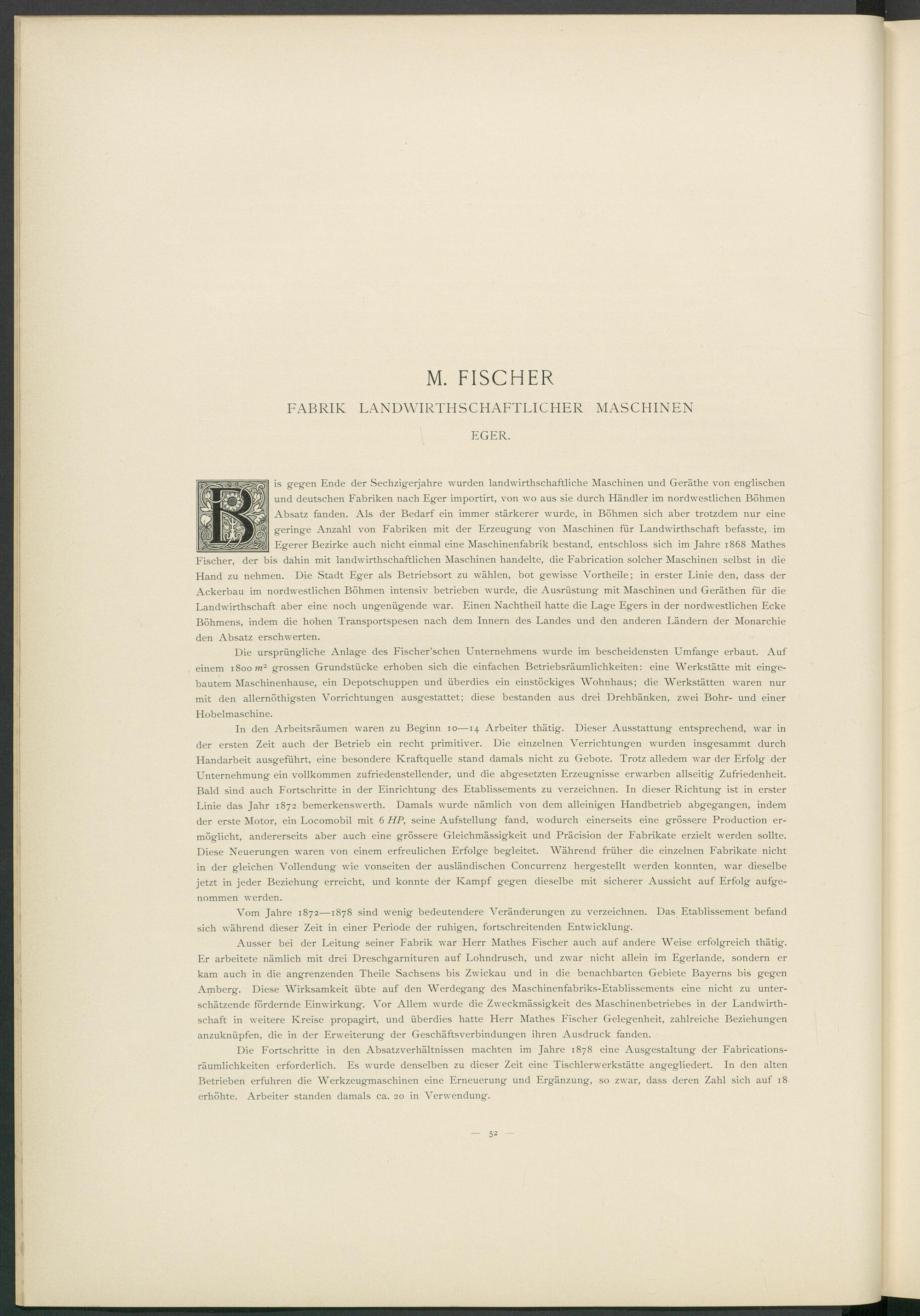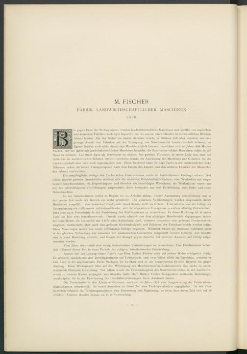 is gegen Ende der Sechzigerjahre wurden landwirthschaftliche Maschinen und Geräthe von englischen und deutschen Fabriken nach Eger importirt, von wo aus sie durch Händler im nordwestlichen Böhmen Absatz fanden. Als der Bedarf ein immer stärkerer wurde, in Böhmen sich aber trotzdem nur eine geringe Anzahl von Fabriken mit der Erzeugung von Maschinen für Landwirthschaft befasste, im Egerer Bezirke auch nicht einmal eine Maschinenfabrik bestand, entschloss sich im Jahre 1868 Mathes Fischer, der bis dahin mit landwirthschaftlichen Maschinen handelte, die Fabrication solcher Maschinen selbst in die Hand zu nehmen. Die Stadt Eger als Betriebsort zu wählen, bot gewisse Vortheile; in erster Linie den, dass der Ackerbau im nordwestlichen Böhmen intensiv betrieben wurde, die Ausrüstung mit Maschinen und Geräthen für die Landwirthschaft aber eine noch ungenügende war. Einen Nachtheil hatte die Lage Egers in der nordwestlichen Ecke Böhmens, indem die hohen Transportspesen nach dem Innern des Landes und den anderen Ländern der Monarchie den Absatz erschwerten.