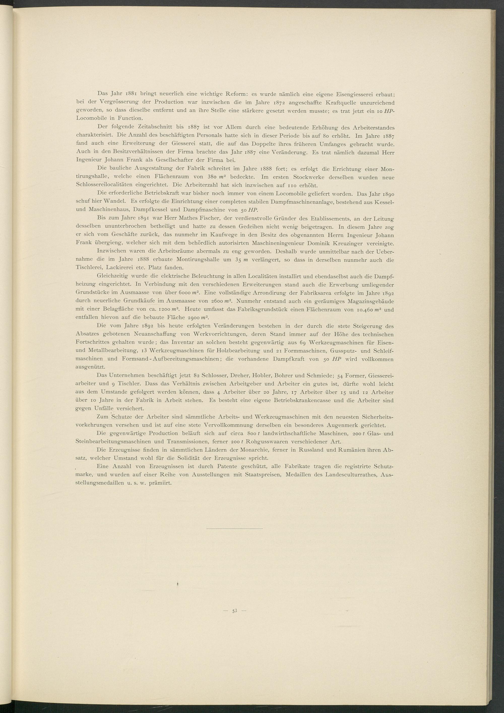 Die vom Jahre 1892 bis heute erfolgten Veränderungen bestehen in der durch die stete Steigerung des Absatzes gebotenen Neuanschaffung von Werkvorrichtungen, deren Stand immer auf der Höhe des technischen Fortschrittes gehalten wurde; das Inventar an solchen besteht gegenwärtig aus 69 Werkzeugmaschinen für Eisen- und Metallbearbeitung, i3 Werkzeugmaschinen für Holzbearbeitung und 21 Formmaschinen, Gussputz- und Schleifmaschinen und Formsand - Aufbereitungsmaschinen; die vorhandene Dampfkraft von 50 HP wird vollkommen ausgenützt.
