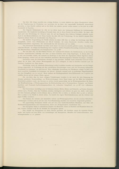 Der folgende Zeitabschnitt bis 1887 ist vor Allem durch eine bedeutende Erhöhung des Arbeiterstandes charakterisirt. Die Anzahl des beschäftigten Personals hatte sich in dieser Periode bis auf 80 erhöht. Im Jahre 1887 fand auch eine Erweiterung der Giesserei statt, die auf das Doppelte ihres früheren Umfanges gebracht wurde. Auch in den Besitzverhältnissen der Firma brachte das Jahr 1887 eine Veränderung. Es trat nämlich dazumal Herr Ingenieur Johann Frank als Gesellschafter der Firma bei.