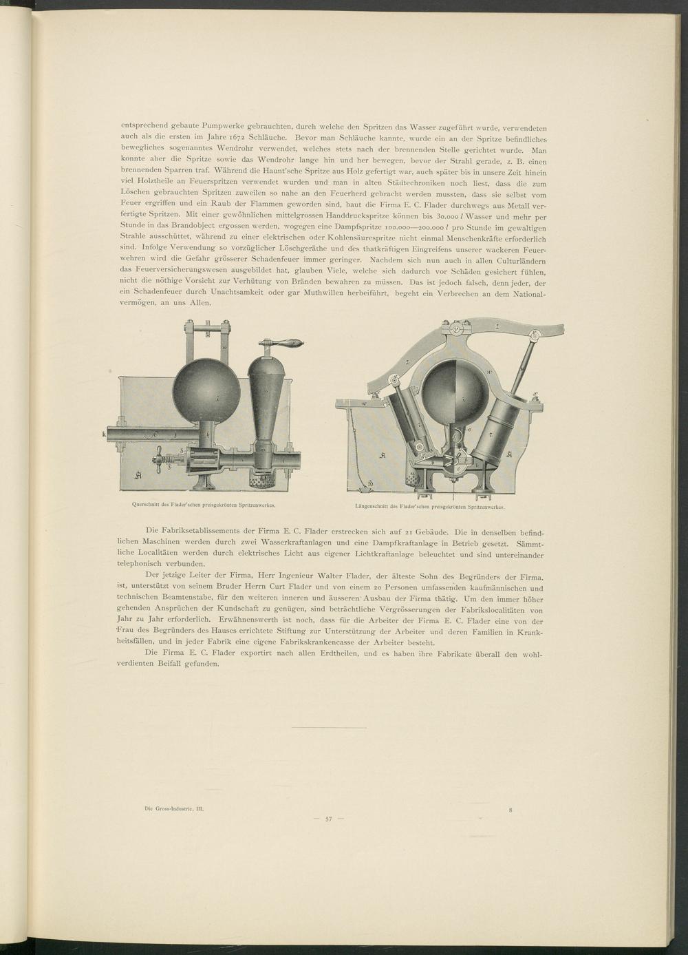 entsprechend gebaute Pumpwerke gebrauchten, durch welche den Spritzen das Wasser zugeführt wurde, verwendeten auch als die ersten im Jahre 1672 Schläuche. Bevor man Schläuche kannte, wurde ein an der Spritze befindliches bewegliches sogenanntes Wendrohr verwendet, welches stets nach der brennenden Stelle gerichtet wurde. Man konnte aber die Spritze sowie das Wendrohr lange hin und her bewegen, bevor der Strahl gerade, z. B. einen brennenden Sparren traf. Während die Haunt’sche Spritze aus Holz gefertigt war, auch später bis in unsere Zeit hinein viel Holztheile an Feuerspritzen verwendet wurden und man in alten Städtechroniken noch liest, dass die zum Löschen gebrauchten Spritzen zuweilen so nahe an den Feuerherd gebracht werden mussten, dass sie selbst vom Feuer ergriffen und ein Raub der Flammen geworden sind, baut die Firma E. C. Flader durchwegs aus Metall verfertigte Spritzen. Mit einer gewöhnlichen mittelgrossen Handdruckspritze können bis 3o.ooo l Wasser und mehr per Stunde in das Brandobject ergossen werden, wogegen eine Dampfspritze 100.000—200.000 l pro Stunde im gewaltigen Strahle ausschüttet, während zu einer elektrischen oder Kohlensäurespritze nicht einmal Menschenkräfte erforderlich sind. Infolge Verwendung so vorzüglicher Löschgeräthe und des thatkräftigen Eingreifens unserer wackeren Feuerwehren wird die Gefahr grösserer Schadenfeuer immer geringer. Nachdem sich nun auch in allen Culturländern das Feuerversicherungswesen ausgebildet hat, glauben Viele, welche sich dadurch vor Schäden gesichert fühlen, nicht die nöthige Vorsicht zur Verhütung von Bränden bewahren zu müssen. Das ist jedoch falsch, denn jeder, der ein Schadenfeuer durch Unachtsamkeit oder gar Muthwillen herbeiführt, begeht ein Verbrechen an dem Nationalvermögen, an uns Allen.