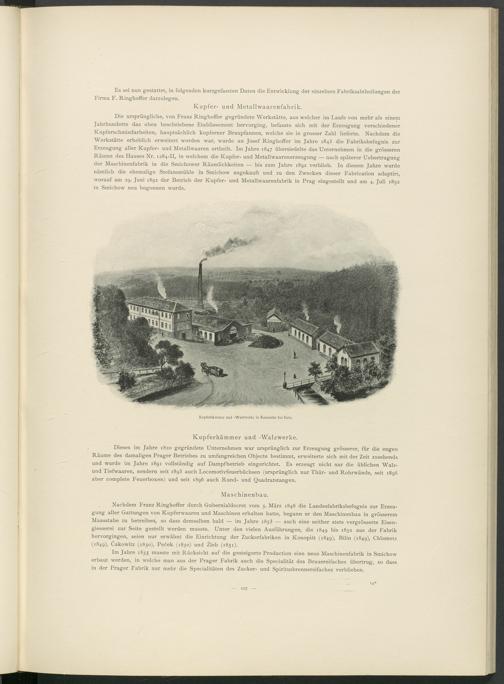 Nachdem Franz Ringhoffer durch Gubernialdecret vom 5. März 1848 die Landesfabriksbefugnis zur Erzeugung aller Gattungen von Kupferwaaren und Maschinen erhalten hatte, begann er den Maschinenbau in grösserem Maasstabe zu betreiben, so dass demselben bald — im Jahre 1853 — auch eine seither stets vergrösserte Eisen- giesserei zur Seite gestellt werden musste. Unter den vielen Ausführungen, die 1849 bis 1852 aus der Fabrik hervorgingen, seien nur erwähnt die Einrichtung der Zuckerfabriken in Konopiät (1849), Bilin (1849), Chlumetz (1849), Cakowitz (1850), Peöek (1850) und 2 leb (1851).