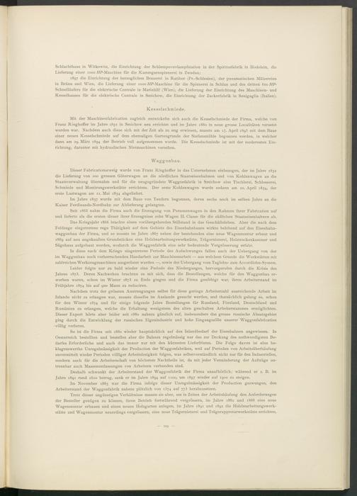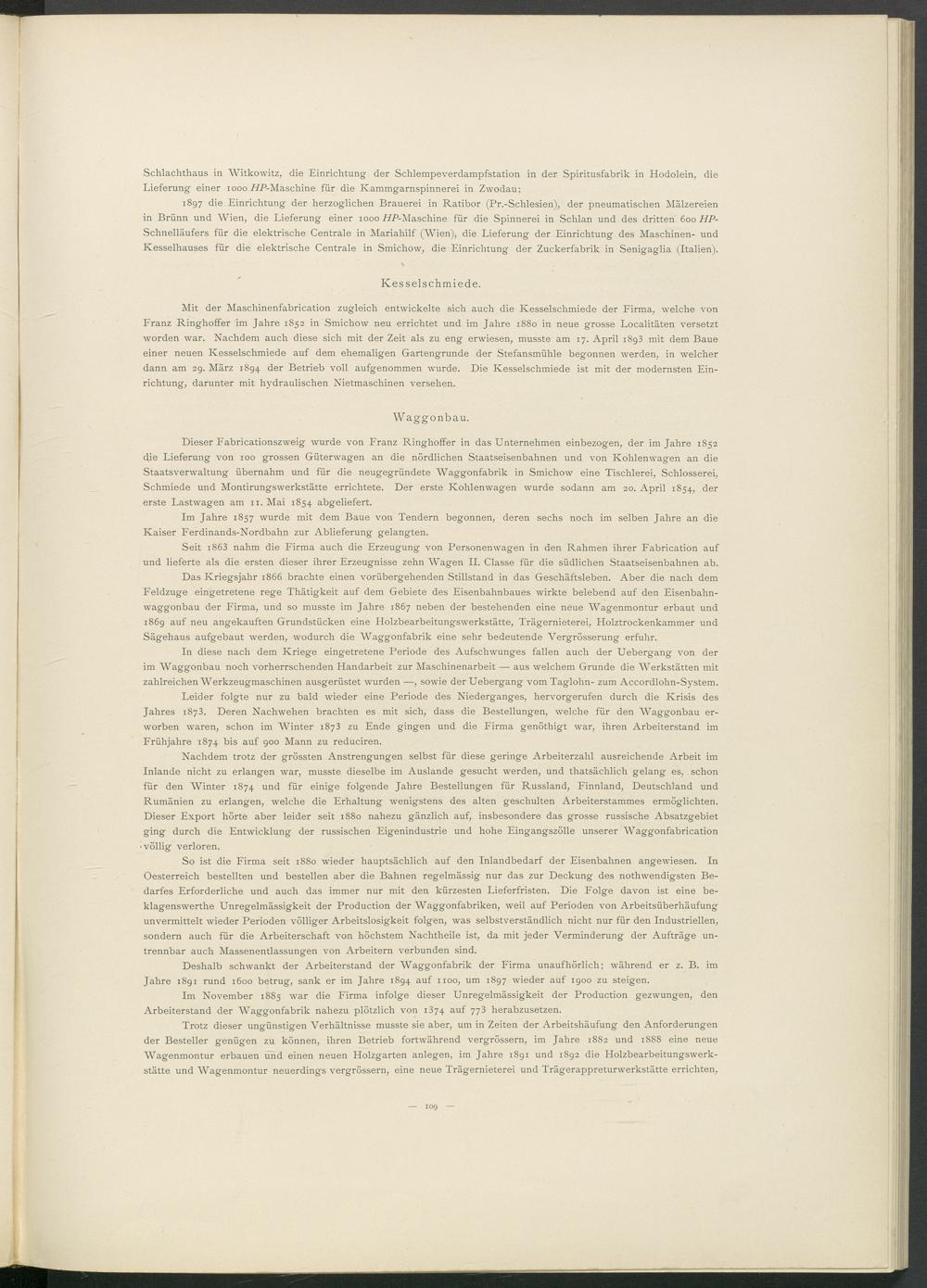 So ist die Firma seit 1880 wieder hauptsächlich auf den Inlandbedarf der Eisenbahnen angewiesen. In Oesterreich bestellten und bestellen aber die Bahnen regelmässig nur das zur Deckung des nothwendigsten Bedarfes Erforderliche und auch das immer nur mit den kürzesten Lieferfristen. Die Folge davon ist eine be- klagenswerthe Unregelmässigkeit der Production der Waggonfabriken, weil auf Perioden von Arbeitsüberhäufung unvermittelt wieder Perioden völliger Arbeitslosigkeit folgen, was selbstverständlich nicht nur für den Industriellen, sondern auch für die Arbeiterschaft von höchstem Nachtheile ist, da mit jeder Verminderung der Aufträge untrennbar auch Massenentlassungen von Arbeitern verbunden sind.