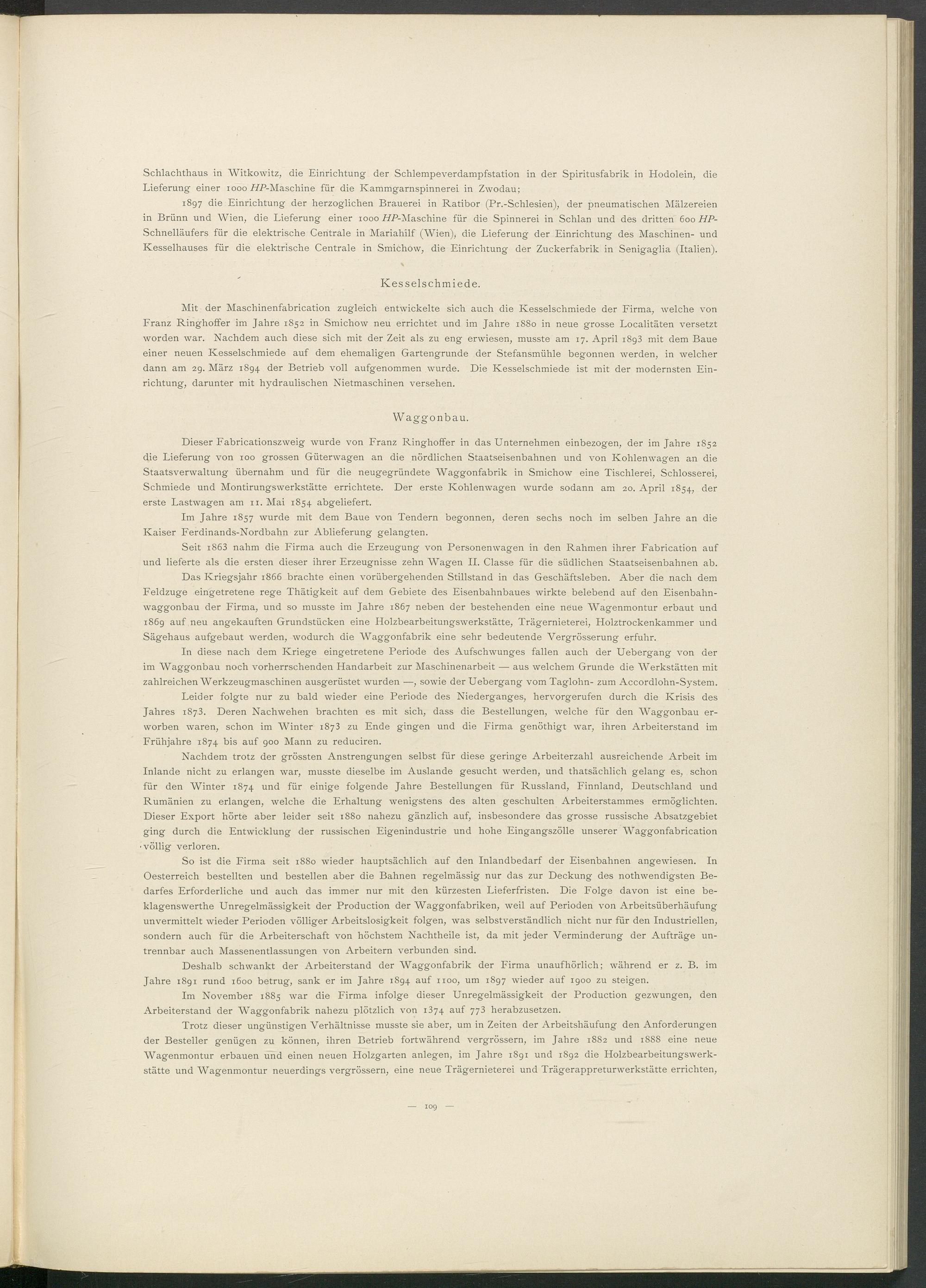 Dieser Fabricationszweig wurde von Franz Ringhoffer in das Unternehmen einbezogen, der im Jahre 1852 die Lieferung von 100 grossen Güterwagen an die nördlichen Staatseisenbahnen und von Kohlenwagen an die Staatsverwaltung übernahm und für die neugegründete Waggonfabrik in Smichow eine Tischlerei, Schlosserei, Schmiede und Montirungswerkstätte errichtete. Der erste Kohlenwagen wurde sodann am 20. April 1854, der erste Lastwagen am 11. Mai 1854 abgeliefert.