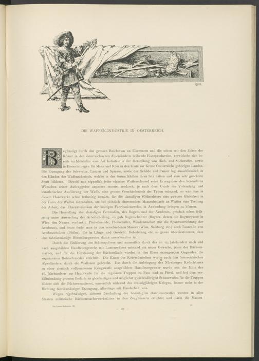 egünstigt durch den grossen Reichthum an Eisenerzen und die schon seit den Zeiten der Römer in den österreichischen Alpenländern blühende Eisenproduction, entwickelte sich bereits im Mittelalter eine Art Industrie in der Herstellung von Hieb- und Stichwaffen, sowie in Eisenrüstungen für Mann und Ross in den heute zur Krone Oesterreichs gehörigen Landen. Die Erzeugung der Schwerter, Lanzen und Spiesse, sowie der Schilde und Panzer lag ausschliesslich in den Händen der Waffenschmiede, welche in den festen Städten ihren Sitz hatten und eine sehr geachtete Zunft bildeten. Obwohl nun eigentlich jeder einzelne Waffenschmied seine Erzeugnisse den besonderen Wünschen seiner Auftraggeber anpassen musste, wodurch, je nach dem Grade der Vollendung und künstlerischen Ausführung der Waffe, eine grosse Verschiedenheit der Typen entstand, so war man in diesem Handwerke schon frühzeitig bemüht, für die damaligen Söldnerheere eine gewisse Gleichheit in der Form der Waffen einzuhalten, um bei plötzlich eintretendem Massenbedarfe an Waffen eine Theilung der Arbeit, das Charakteristikon der heutigen Fabricationsweise, in Anwendung bringen zu können.