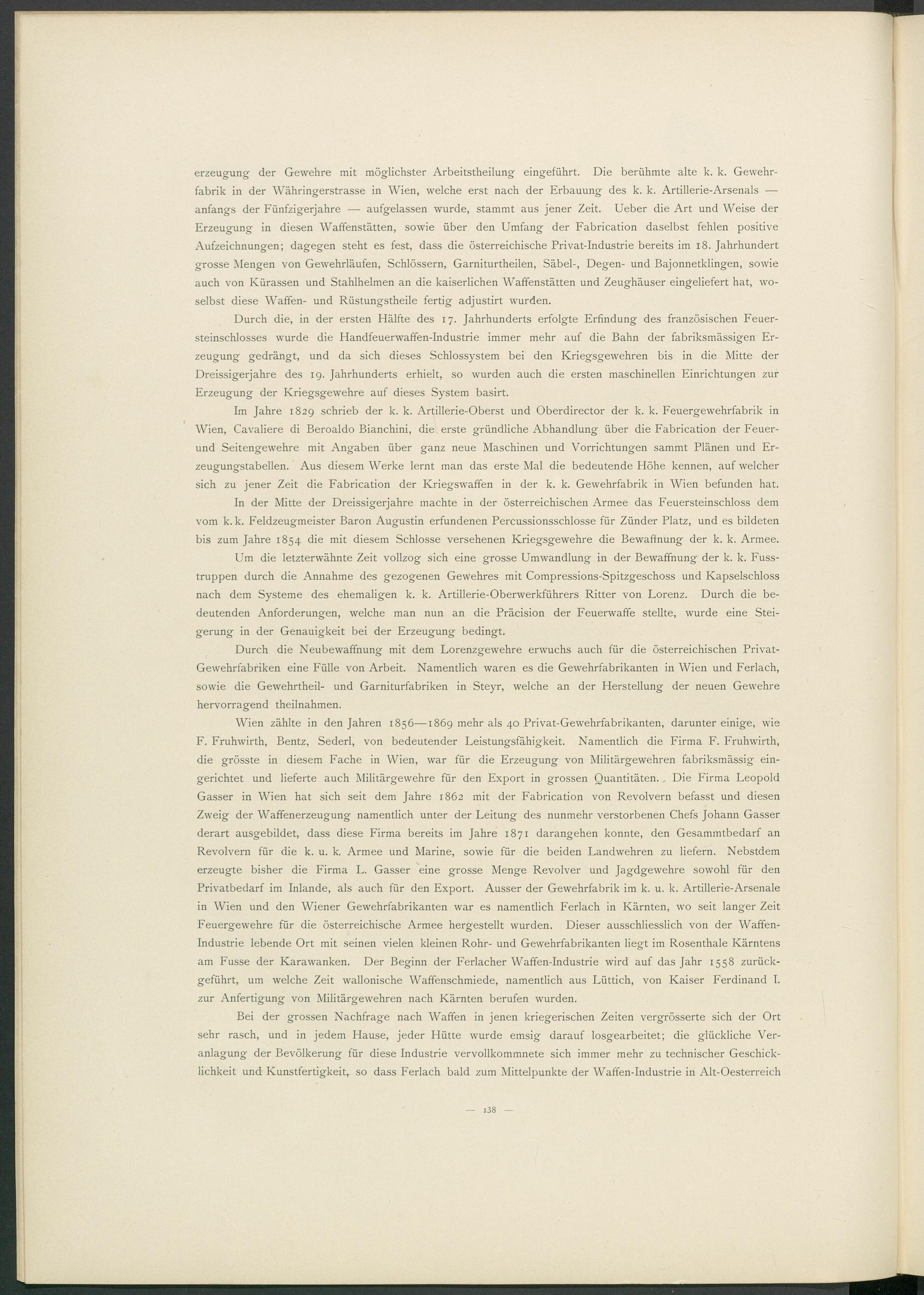Wien zählte in den Jahren 1856—1869 mehr als 40 Privat-Gewehrfabrikanten, darunter einige, wie F. Fruhwirth, Bentz, Sederl, von bedeutender Leistungsfähigkeit. Namentlich die Firma F. Fruhwirth, die grösste in diesem Fache in Wien, war für die Erzeugung von Militärgewehren fabriksmässig eingerichtet und lieferte auch Militärgewehre für den Export in grossen Quantitäten. . Die Firma Leopold Gasser in Wien hat sich seit dem Jahre 1862 mit der Fabrication von Revolvern befasst und diesen Zweig der Waffenerzeugung namentlich unter der Leitung des nunmehr verstorbenen Chefs Johann Gasser derart ausgebildet, dass diese Firma bereits im Jahre 1871 darangehen konnte, den Gesammtbedarf an Revolvern für die k. u. k. Armee und Marine, sowie für die beiden Landwehren zu liefern. Nebstdem erzeugte bisher die Firma L. Gasser eine grosse Menge Revolver und Jagdgewehre sowohl für den Privatbedarf im Inlande, als auch für den Export. Ausser der Gewehrfabrik im k. u. k. Artillerie-Arsenale in Wien und den Wiener Gewehrfabrikanten war es namentlich Ferlach in Kärnten, wo seit langer Zeit Feuergewehre für die österreichische Armee hergestellt wurden. Dieser ausschliesslich von der Waffenindustrie lebende Ort mit seinen vielen kleinen Rohr- und Gewehrfabrikanten liegt im Rosenthale Kärntens am Fusse der Karawanken. Der Beginn der Ferlacher Waffen-Industrie wird auf das Jahr 1558 zurückgeführt, um welche Zeit wallonische Waffenschmiede, namentlich aus Lüttich, von Kaiser Ferdinand I. zur Anfertigung von Militärgewehren nach Kärnten berufen wurden.