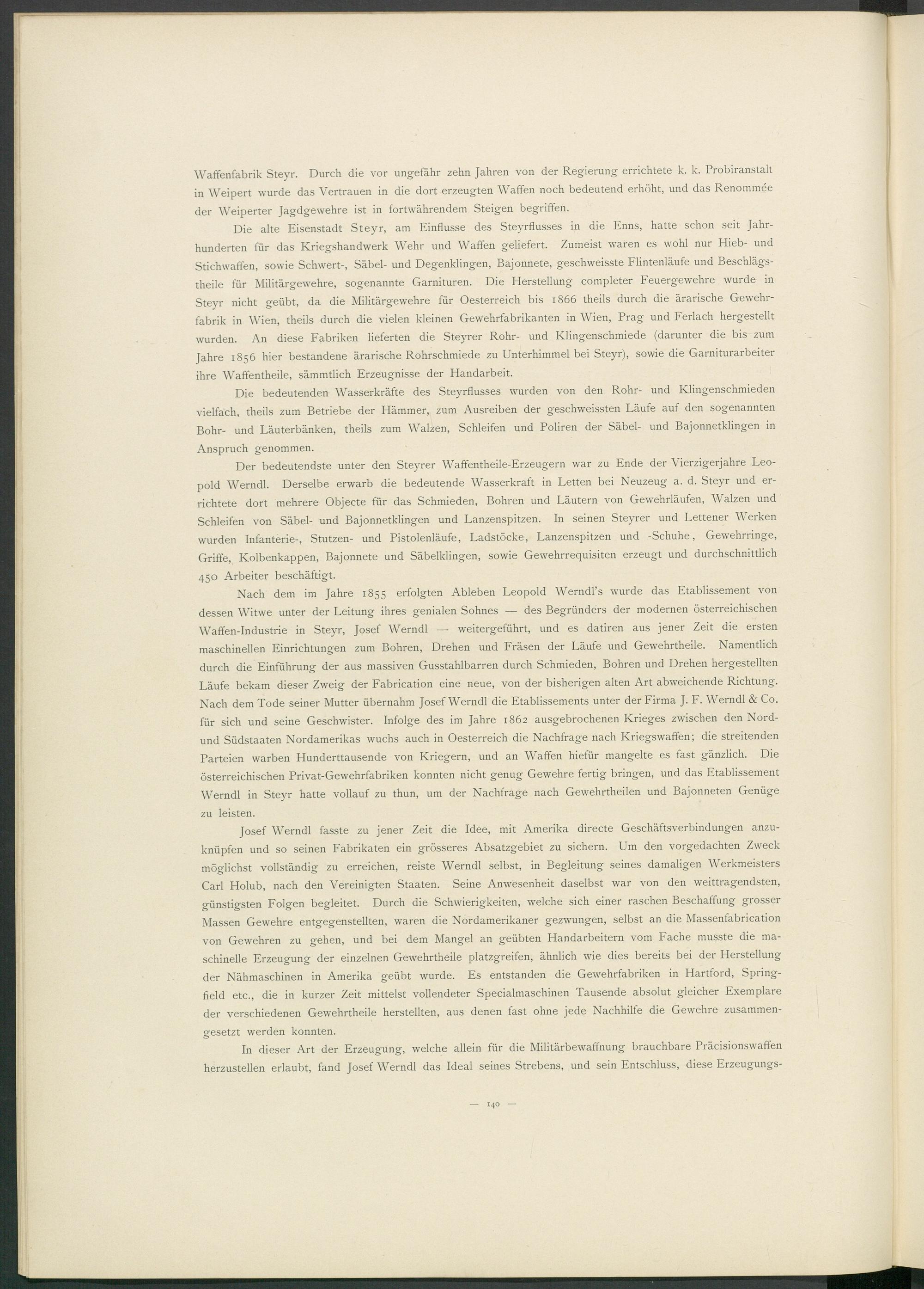 Nach dem im Jahre 1855 erfolgten Ableben Leopold Werndl’s wurde das Etablissement von dessen Witwe unter der Leitung ihres genialen Sohnes — des Begründers der modernen österreichischen Waffen-Industrie in Steyr, Josef Werndl —• weitergeführt, und es datiren aus jener Zeit die ersten maschinellen Einrichtungen zum Bohren, Drehen und Fräsen der Läufe und Gewehrtheile. Namentlich durch die Einführung der aus massiven Gusstahlbarren durch Schmieden, Bohren und Drehen hergestellten Läufe bekam dieser Zweig der Fabrication eine neue, von der bisherigen alten Art abweichende Richtung. Nach dem Tode seiner Mutter übernahm Josef Werndl die Etablissements unter der Firma J. F. Werndl & Co. für sich und seine Geschwister. Infolge des im Jahre 1862 ausgebrochenen Krieges zwischen den Nord- und Südstaaten Nordamerikas wuchs auch in Oesterreich die Nachfrage nach Kriegswaffen; die streitenden Parteien warben Hunderttausende von Kriegern, und an Waffen hiefür mangelte es fast gänzlich. Die österreichischen Privat-Gewehrfabriken konnten nicht genug Gewehre fertig bringen, und das Etablissement Werndl in Steyr hatte vollauf zu thun, um der Nachfrage nach Gewehrtheilen und Bajonneten Genüge zu leisten.