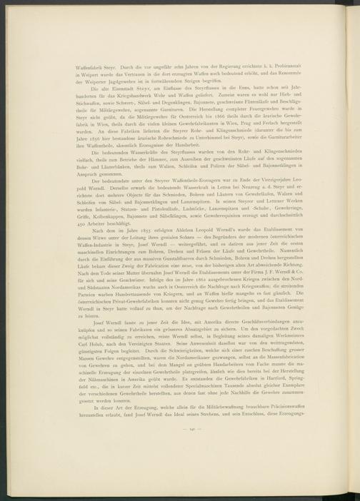 Die alte Eisenstadt Steyr, am Einflüsse des Steyrflusses in die Enns, hatte schon seit Jahrhunderten für das Kriegshandwerk Wehr und Waffen geliefert. Zumeist waren es wohl nur Hieb- und Stichwaffen, sowie Schwert-, Säbel- und Degenklingen, Bajonnete, geschweisste Flintenläufe und Beschlägs- theile für Militärgewehre, sogenannte Garnituren. Die Herstellung compléter Feuergewehre wurde in Steyr nicht geübt, da die Militärgewehre für Oesterreich bis 1866 theils durch die ärarische Gewehrfabrik in Wien, theils durch die vielen kleinen Gewehrfabrikanten in Wien, Prag und Ferlach hergestellt wurden. An diese Fabriken lieferten die Steyrer Rohr- und Klingenschmiede (darunter die bis zum Jahre 1856 hier bestandene ärarische Rohrschmiede zu Unterhimmel bei Steyr), sowie die Garniturarbeiter ihre Waffentheile, sämmtlich Erzeugnisse der Handarbeit.