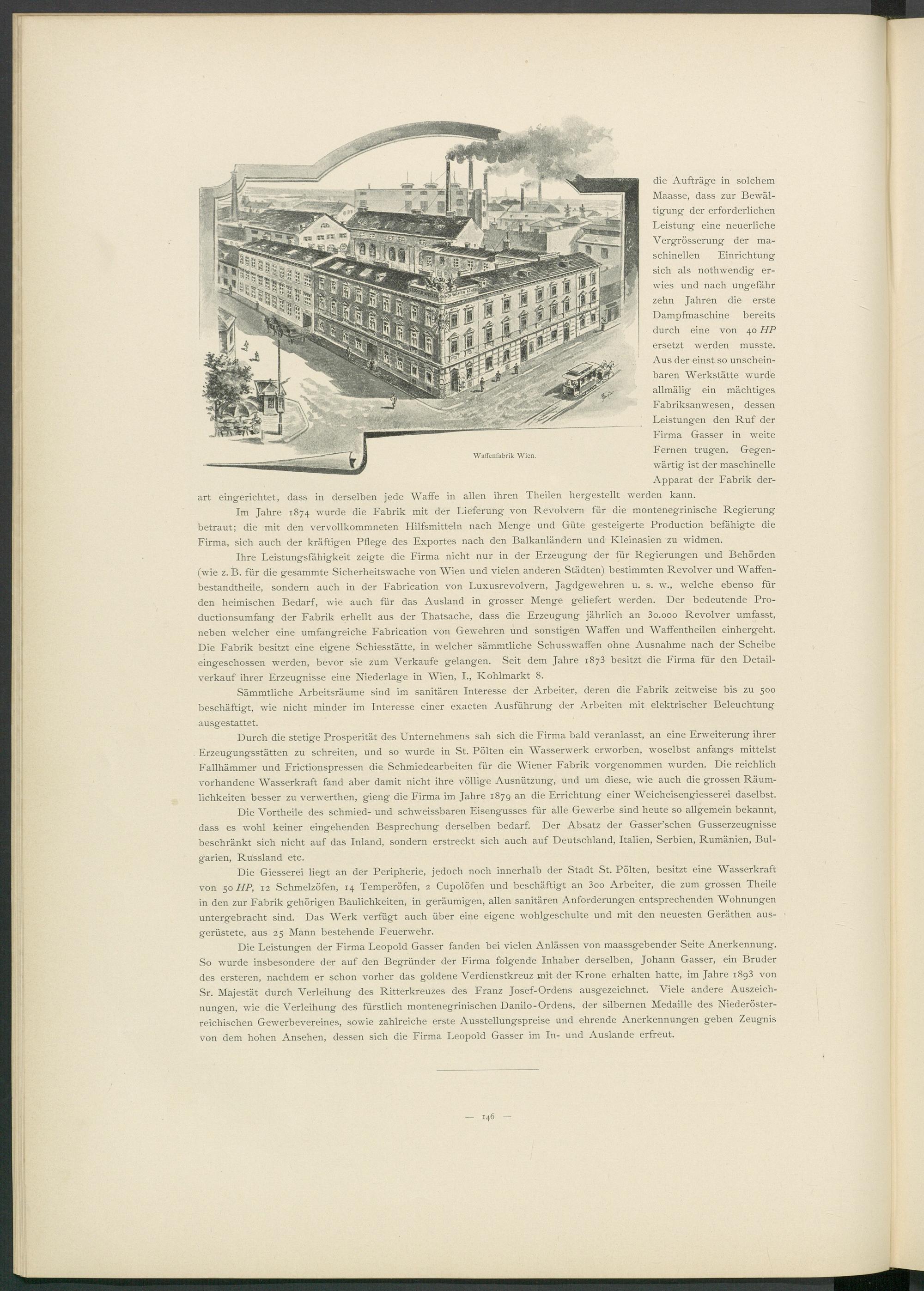 Ihre Leistungsfähigkeit zeigte die Firma nicht nur in der Erzeugung der für Regierungen und Behörden (wie z. B. für die gesammte Sicherheitswache von Wien und vielen anderen Städten) bestimmten Revolver und Waffen- bestandtheile, sondern auch in der Fabrication von Luxusrevolvern, Jagdgewehren u. s. w., welche ebenso für den heimischen Bedarf, wie auch für das Ausland in grosser Menge geliefert werden. Der bedeutende Pro- ductionsumfang der Fabrik erhellt aus der Thatsache, dass die Erzeugung jährlich an 3o.ooo Revolver umfasst, neben welcher eine umfangreiche Fabrication von Gewehren und sonstigen Waffen und Waffentheilen einhergeht. Die Fabrik besitzt eine eigene Schiesstätte, in welcher sämmtliche Schusswaffen ohne Ausnahme nach der Scheibe eingeschossen werden, bevor sie zum Verkaufe gelangen. Seit dem Jahre 1873 besitzt die Firma für den Detailverkauf ihrer Erzeugnisse eine Niederlage in Wien, I., Kohlmarkt 8.