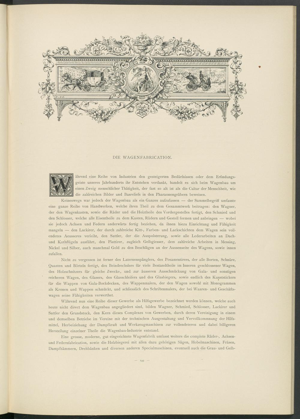 ährend eine Reihe von Industrien den gesteigerten Bedürfnissen oder dem Erfindungsgeiste unseres Jahrhunderts ihr Entstehen verdankt, handelt es sich beim Wagenbau um einen Zweig menschlicher Thätigkeit, der fast so alt ist als die Cultur der Menschheit, wie die zahlreichen Bilder und Basreliefs in den Pharaonengräbern beweisen.