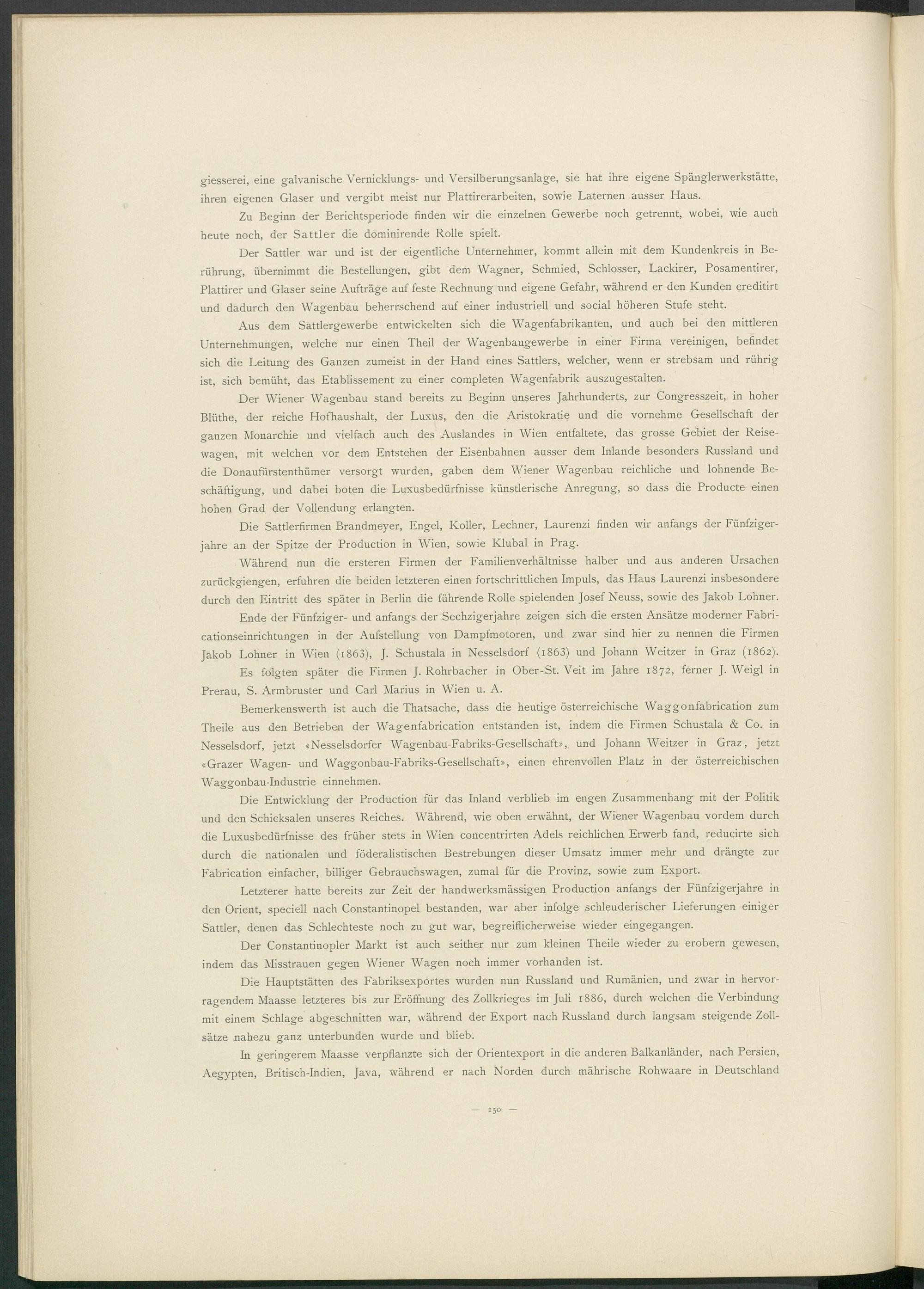 Bemerkenswerth ist auch die Thatsache, dass die heutige österreichische Waggonfabrication zum Theile aus den Betrieben der Wagenfabrication entstanden ist, indem die Firmen Schustala & Co. in Nesselsdorf, jetzt «Nesselsdorfer Wagenbau-Fabriks-Gesellschaft», und Johann Weitzer in Graz, jetzt «Grazer Wagen- und Waggonbau-Fabriks-Gesellschaft», einen ehrenvollen Platz in der österreichischen Waggonbau-Industrie einnehmen.
