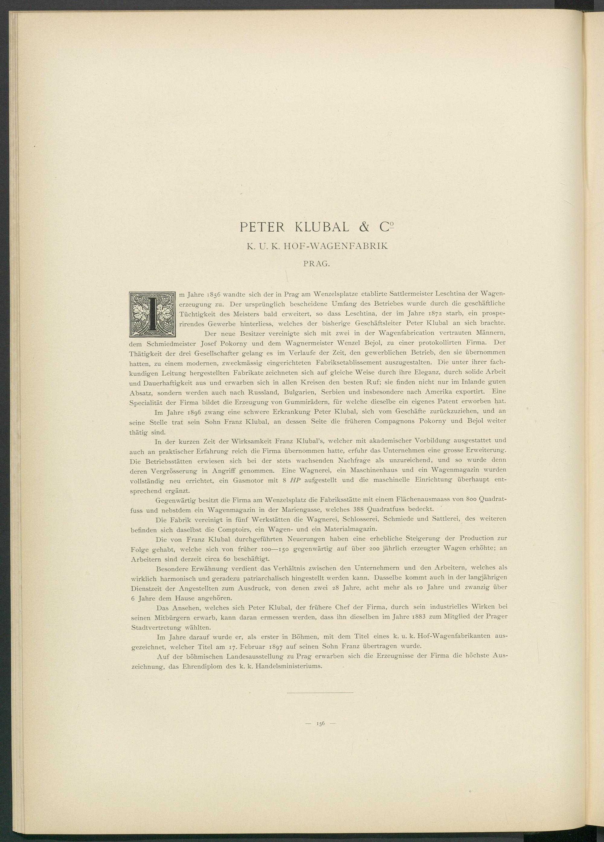 m Jahre 1856 wandte sich der in Prag am Wenzelsplatze etablirte Sattlermeister Leschtina der Wagenerzeugung zu. Der ursprünglich bescheidene Umfang des Betriebes wurde durch die geschäftliche Tüchtigkeit des Meisters bald erweitert, so dass Leschtina, der im Jahre 1872 starb, ein prospe- rirendes Gewerbe hinterliess, welches der bisherige Geschäftsleiter Peter Klubal an sich brachte. Der neue Besitzer vereinigte sich mit zwei in der Wagenfabrication vertrauten Männern, dem Schmiedmeister Josef Pokorny und dem Wagnermeister Wenzel Bejol, zu einer protokollirten Firma. Der Thätigkeit der drei Gesellschafter gelang es im Verlaufe der Zeit, den gewerblichen Betrieb, den sie übernommen hatten, zu einem modernen, zweckmässig eingerichteten Fabriksetablissement auszugestalten. Die unter ihrer fachkundigen Leitung hergestellten Fabrikate zeichneten sich auf gleiche Weise durch ihre Eleganz, durch solide Arbeit und Dauerhaftigkeit aus und erwarben sich in allen Kreisen den besten Ruf; sie finden nicht nur im Inlande guten Absatz, sondern werden auch nach Russland, Bulgarien, Serbien und insbesondere nach Amerika exportirt. Eine Specialität der Firma bildet die Erzeugung von Gummirädern, für welche dieselbe ein eigenes Patent erworben hat.