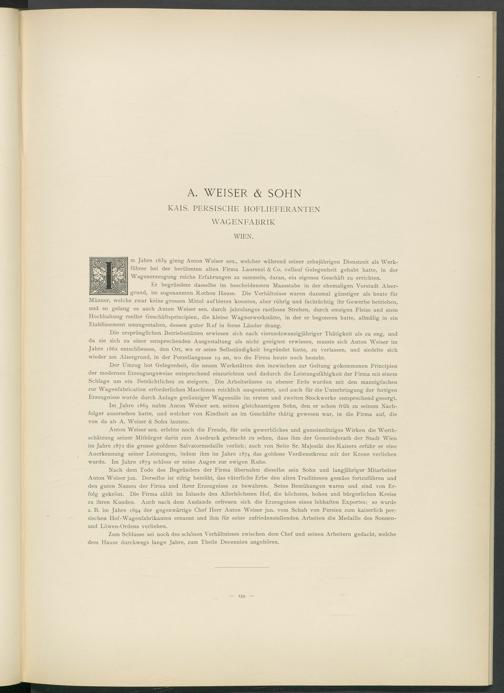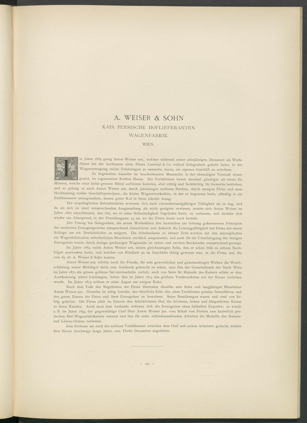 m Jahre i83g gieng Anton Weiser sen., welcher während seiner zehnjährigen Dienstzeit als Werkführer bei der berühmten alten Firma Laurenzi & Co. vollauf Gelegenheit gehabt hatte, in der Wagenerzeugung reiche Erfahrungen zu sammeln, daran, ein eigenes Geschäft zu errichten.