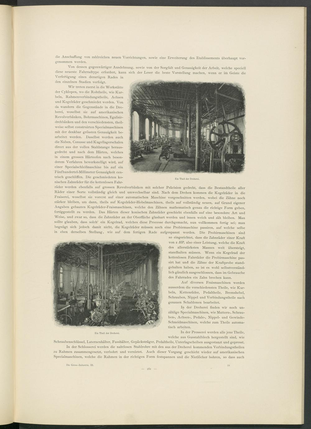 In der Dreherei finden wir noch unzählige Specialmaschinen, wie Muttern-, Schrauben-, Achsen-, Pedale-, Nippel- und Gewindeschneidmaschinen, welche zum Theile automatisch arbeiten.
