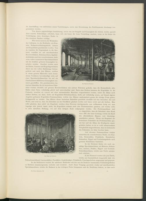 Von dessen gegenwärtiger Ausdehnung, sowie von der Sorgfalt und Genauigkeit der Arbeit, welche speciell diese neueste Fahrradtype erfordert, kann sich der Leser die beste Vorstellung machen, wenn er im Geiste die Verfertigung eines derartigen Rades in den einzelnen Stadien verfolgt.