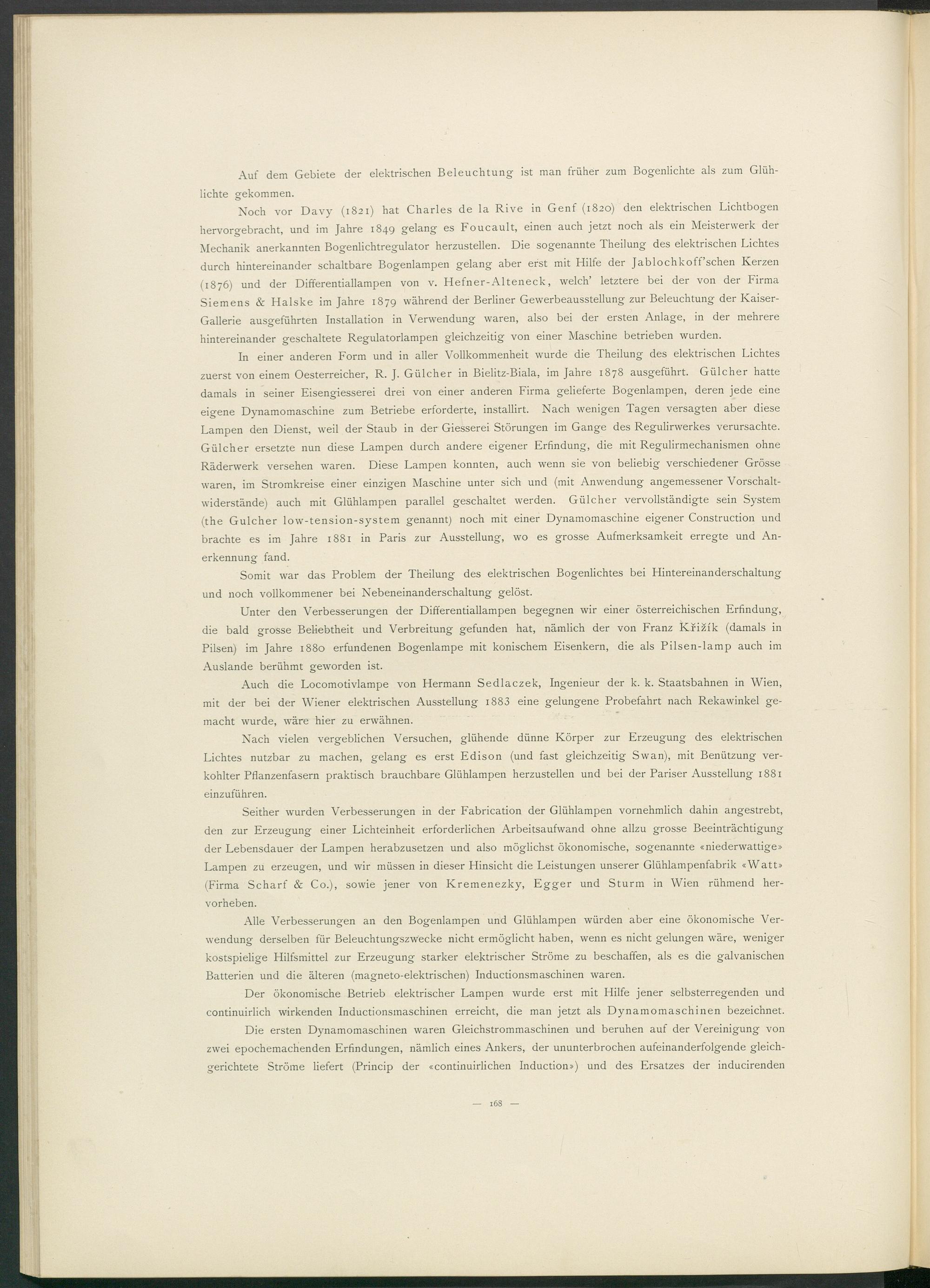 Noch vor Davy (1821) hat Charles de la Rive in Genf (1820) den elektrischen Lichtbogen hervorgebracht, und im Jahre 1849 gelang es Foucault, einen auch jetzt noch als ein Meisterwerk der Mechanik anerkannten Bogenlichtregulator herzustellen. Die sogenannte Theilung des elektrischen Lichtes durch hintereinander schaltbare Bogenlampen gelang aber erst mit Hilfe der Jablochkoff’schen Kerzen (1876) und der Differentiallampen von v. Hefner-Alteneck, welch’ letztere bei der von der Firma Siemens & Halske im Jahre 1879 während der Berliner Gewerbeausstellung zur Beleuchtung der Kaiser- Gallerie ausgeführten Installation in Verwendung waren, also bei der ersten Anlage, in der mehrere hintereinander geschaltete Regulatorlampen gleichzeitig von einer Maschine betrieben wurden.