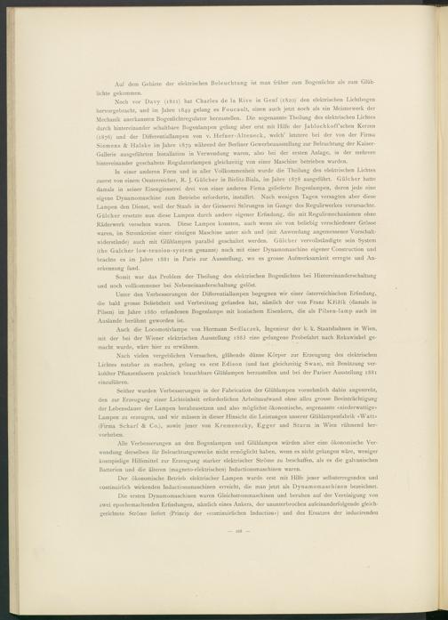 Seither wurden Verbesserungen in der Fabrication der Glühlampen vornehmlich dahin angestrebt, den zur Erzeugung einer Lichteinheit erforderlichen Arbeitsaufwand ohne allzu grosse Beeinträchtigung der Lebensdauer der Lampen herabzusetzen und also möglichst ökonomische, sogenannte «niederwattige» Lampen zu erzeugen, und wir müssen in dieser Hinsicht die Leistungen unserer Glühlampenfabrik «Watt» (Firma Scharf & Co.), sowie jener von Kremenezky, Egger und Sturm in Wien rühmend hervorheben.