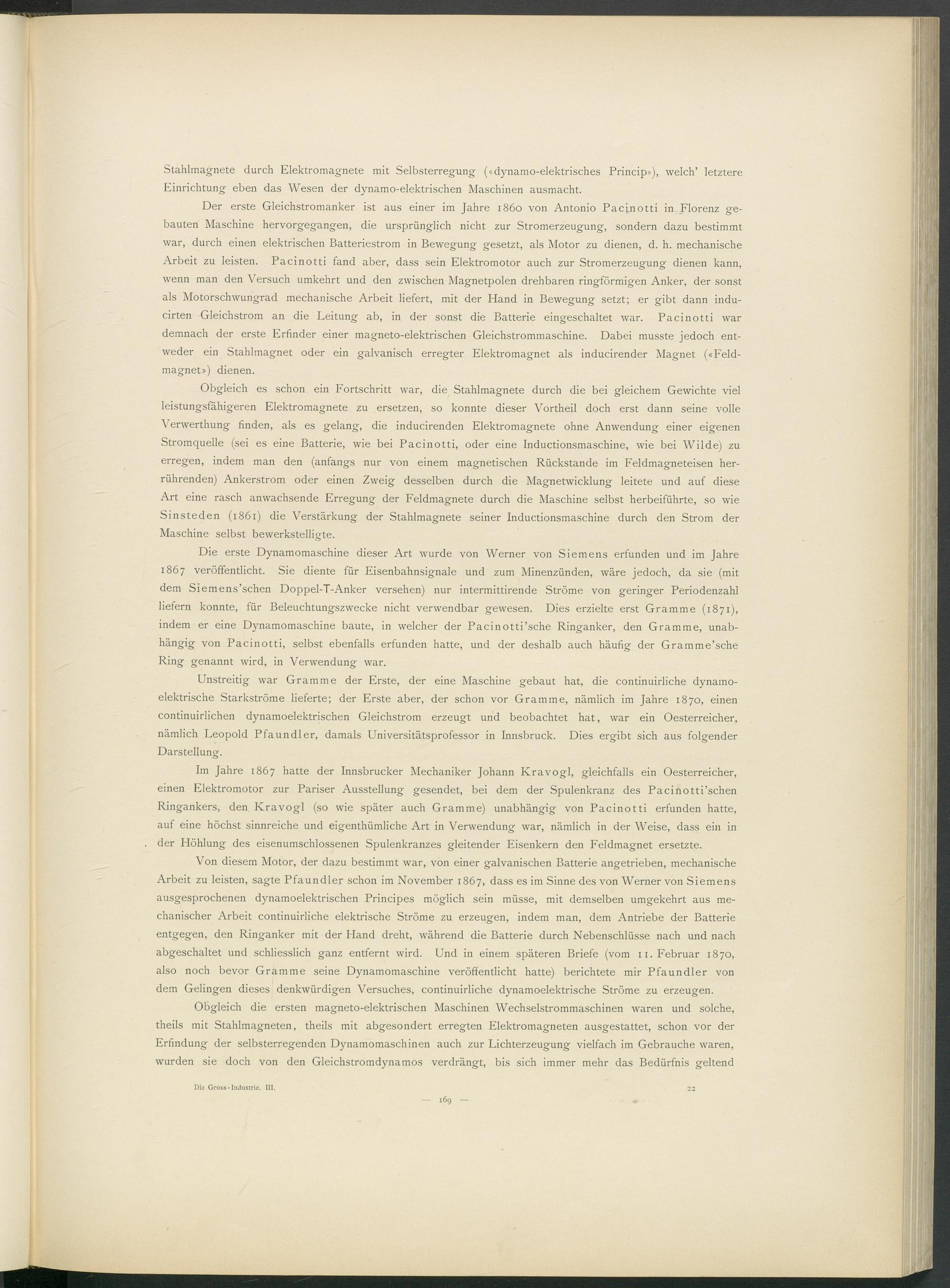 Unstreitig war Gramme der Erste, der eine Maschine gebaut hat, die continuirliche dynamoelektrische Starkströme lieferte; der Erste aber, der schon vor Gramme, nämlich im Jahre 1870, einen continuirlichen dynamoelektrischen Gleichstrom erzeugt und beobachtet hat, war ein Oesterreicher, nämlich Leopold Pfaundler, damals Universitätsprofessor in Innsbruck. Dies ergibt sich aus folgender Darstellung.