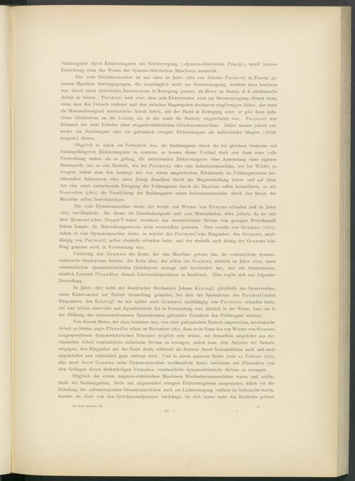 Von diesem Motor, der dazu bestimmt war, von einer galvanischen Batterie angetrieben, mechanische Arbeit zu leisten, sagte Pfaundler schon im November 1867, dass es im Sinne des von Werner von Siemens ausgesprochenen dynamoelektrischen Principes möglich sein müsse, mit demselben umgekehrt aus mechanischer Arbeit continuirliche elektrische Ströme zu erzeugen, indem man, dem Antriebe der Batterie entgegen, den Ringanker mit der Hand dreht, während die Batterie durch Nebenschlüsse nach und nach abgeschaltet und schliesslich ganz entfernt wird. Und in einem späteren Briefe (vom 11. Februar 1870, also noch bevor Gramme seine Dynamomaschine veröffentlicht hatte) berichtete mir Pfaundler von dem Gelingen dieses denkwürdigen Versuches, continuirliche dynamoelektrische Ströme zu erzeugen.