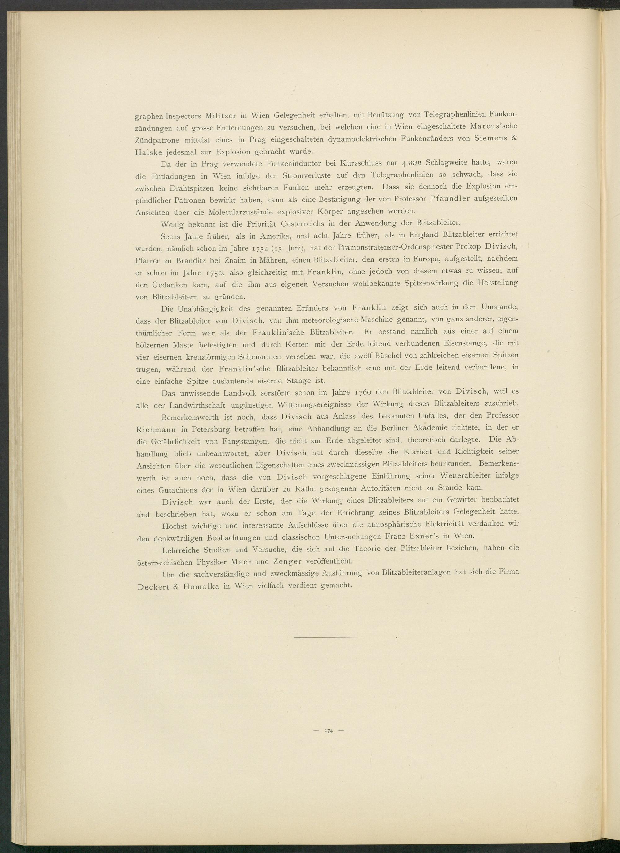Bemerkenswerth ist noch, dass Divisch aus Anlass des bekannten Unfalles, der den Professor Richmann in Petersburg betroffen hat, eine Abhandlung an die Berliner Akademie richtete, in der er die Gefährlichkeit von Fangstangen, die nicht zur Erde abgeleitet sind, theoretisch darlegte. Die Abhandlung blieb unbeantwortet, aber Divisch hat durch dieselbe die Klarheit und Richtigkeit seiner Ansichten über die wesentlichen Eigenschaften eines zweckmässigen Blitzableiters beurkundet. Bemerkenswerth ist auch noch, dass die von Divisch vorgeschlagene Einführung seiner Wetterableiter infolge eines Gutachtens der in Wien darüber zu Rathe gezogenen Autoritäten nicht zu Stande kam.