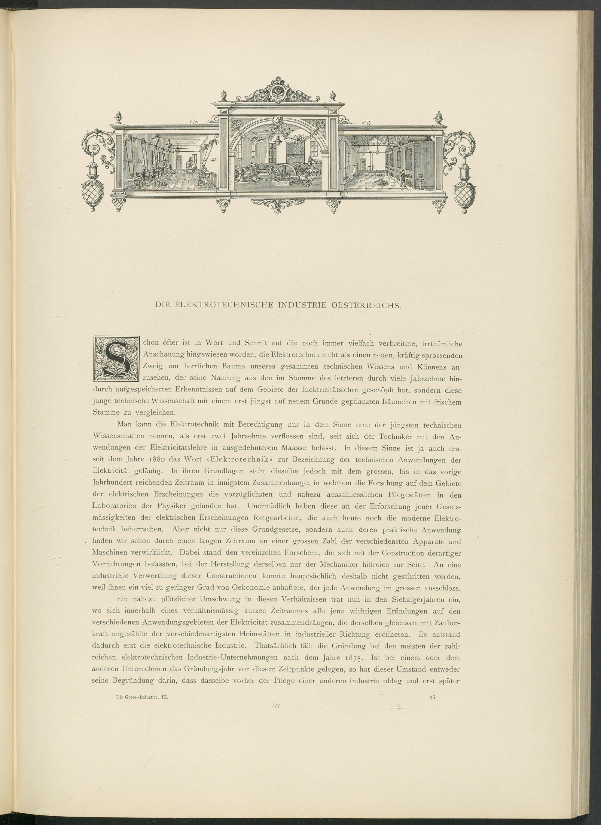 Ein nahezu plötzlicher Umschwung in diesen Verhältnissen trat nun in den Siebzigerjahren ein, wo sich innerhalb eines verhältnismässig kurzen Zeitraumes alle jene wichtigen Erfindungen auf den verschiedenen Anwendungsgebieten der Elektricität zusammendrängen, die derselben gleichsam mit Zauberkraft ungezählte der verschiedenartigsten Heimstätten in industrieller Richtung eröffneten. Es entstand dadurch erst die elektrotechnische Industrie. Thatsächlich fällt die Gründung bei den meisten der zahlreichen elektrotechnischen Industrie-Unternehmungen nach dem Jahre 1875. Ist bei einem oder dem anderen Unternehmen das Gründungsjahr vor diesem Zeitpunkte gelegen, so hat dieser Umstand entweder seine Begründung darin, dass dasselbe vorher der Pflege einer anderen Industrie oblag und erst später