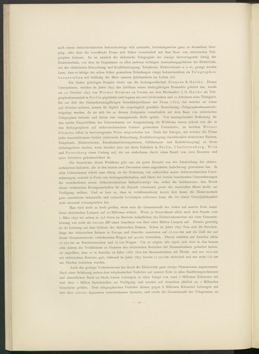 Ein hieher gehöriges Beispiel bietet uns die Actiengesellschaft Siemens & Halske. Dieses Unternehmen, welches im Jahre 1897 das Jubiläum seines fünfzigjährigen Bestandes gefeiert hat, wurde am 12. October 1847 von Werner Siemens im Vereine mit dem Mechaniker J. G. Halske als Telegraphenbauanstalt in Berlin gegründet und begann mit zwei Drehbänken und 10 Arbeitern seine Thätigkeit. Bis zur Zeit des fünfundzwanzigjährigen Geschäftsjubiläums der Firma (1872), bei welcher sie schon 543 Arbeiter aufwies, konnte ihr füglich die ursprünglich gewählte Bezeichnung «Telegraphenbauanstalt» beigelegt werden, da sie sich bis zu diesem Zeitpunkte vornehmlich mit dem Baue von elektrischen Telegraphen befasste und hierin eine tonangebende Rolle spielte. Von maassgebender Bedeutung für das rasche Emporblühen des Unternehmens zur Ausgestaltung als Weltfirma waren jedoch erst die in den Siebzigerjahren auf elektrotechnischem Gebiete gemachten Fortschritte, an welchen Werner Siemens selbst in hervorragenderWeise mitgearbeitet hat. Dank der Energie, mit welcher die Firma jedes neuerschlossene Gebiet (elektrische Beleuchtung, Kraftübertragung einschliesslich elektrischer Bahnen, Telephonie, Elektrochemie, Eisenbahnsicherungswesen, Glühlampen- und Kabelerzeugung) zu ihrem Arbeitsgebiete machte, weist dieselbe jetzt mit ihren Fabriken in Berlin, Charlottenburg, Wien und Petersburg einen Umfang auf, der am einfachsten durch einen Stand von 2000 Beamten und 9000 Arbeitern gekennzeichnet ist.