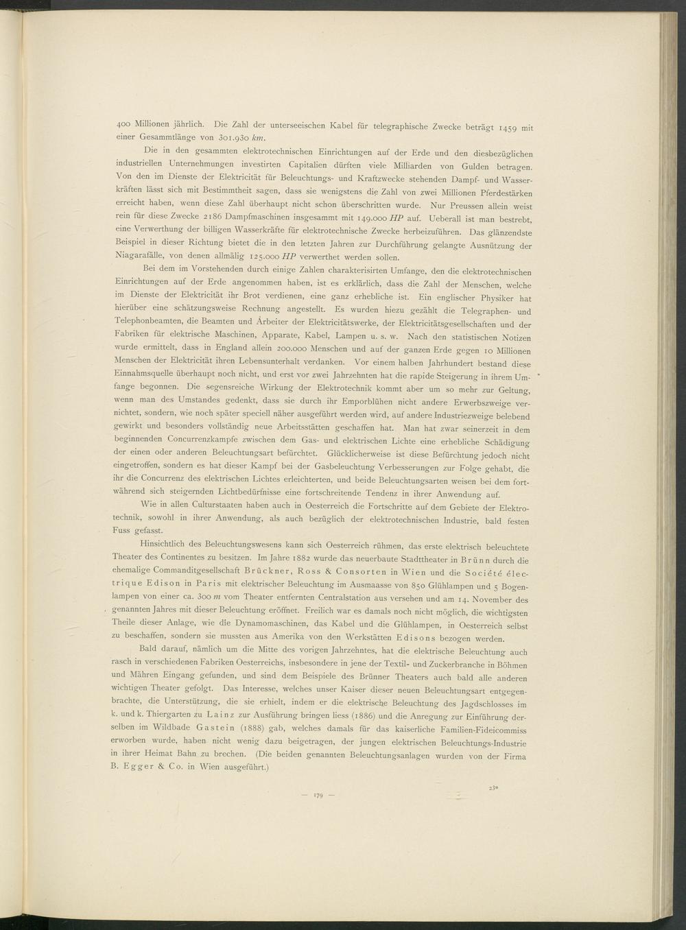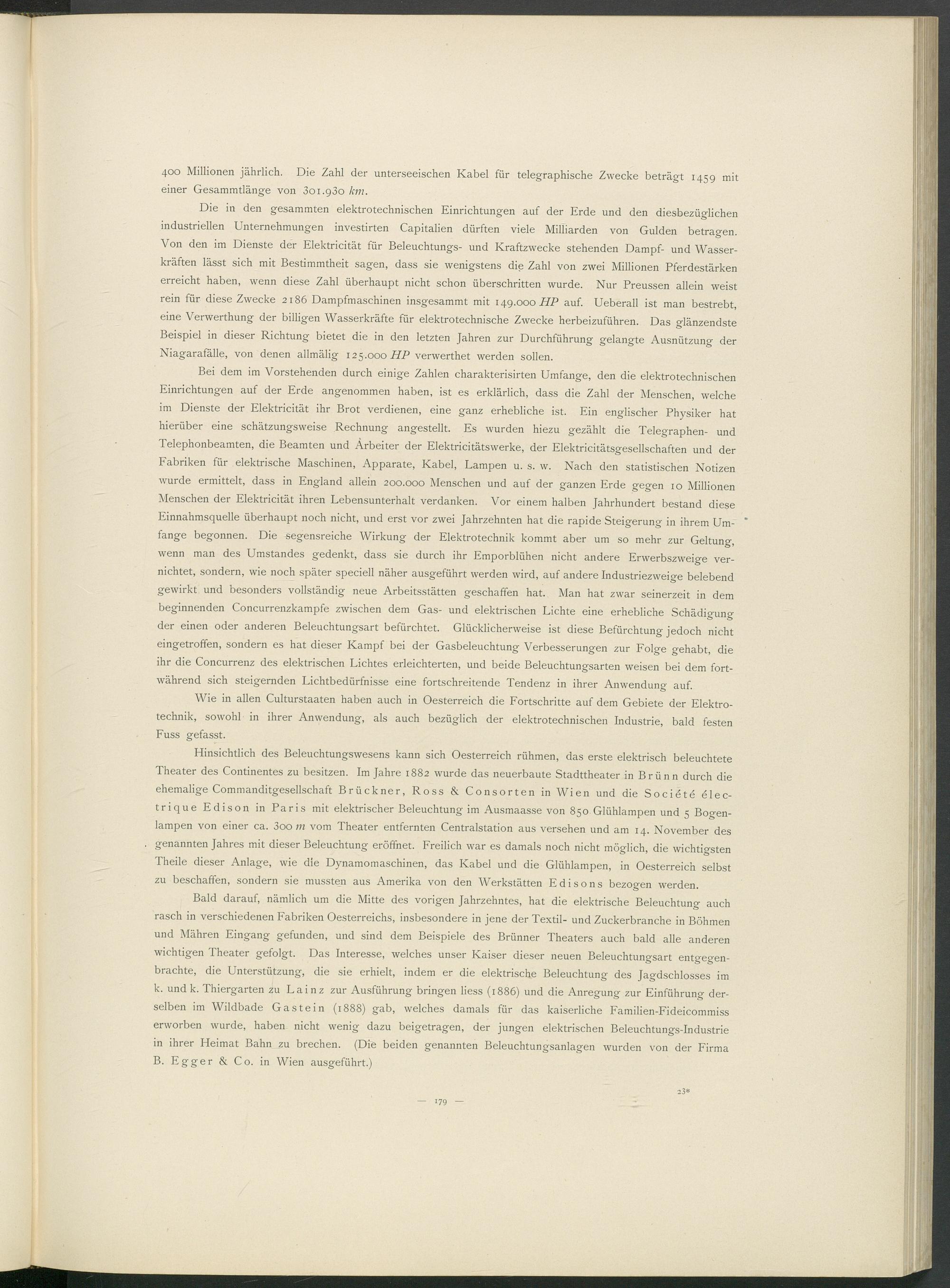 Bald darauf, nämlich um die Mitte des vorigen Jahrzehntes, hat die elektrische Beleuchtung auch rasch in verschiedenen Fabriken Oesterreichs, insbesondere in jene der Textil- und Zuckerbranche in Böhmen und Mähren Eingang gefunden, und sind dem Beispiele des Brünner Theaters auch bald alle anderen wichtigen Theater gefolgt. Das Interesse, welches unser Kaiser dieser neuen Beleuchtungsart entgegenbrachte, die Unterstützung, die sie erhielt, indem er die elektrische Beleuchtung des Jagdschlosses im k. und k. Thiergarten zu Lainz zur Ausführung bringen liess (1886) und die Anregung zur Einführung derselben im Wildbade Gastein (1888) gab, welches damals für das kaiserliche Familien-Fideicommiss erworben wurde, haben nicht wenig dazu beigetragen, der jungen elektrischen Beleuchtungs-Industrie in ihrer Heimat Bahn zu brechen. (Die beiden genannten Beleuchtungsanlagen wurden von der Firma B. Egger & Co. in Wien ausgeführt.)