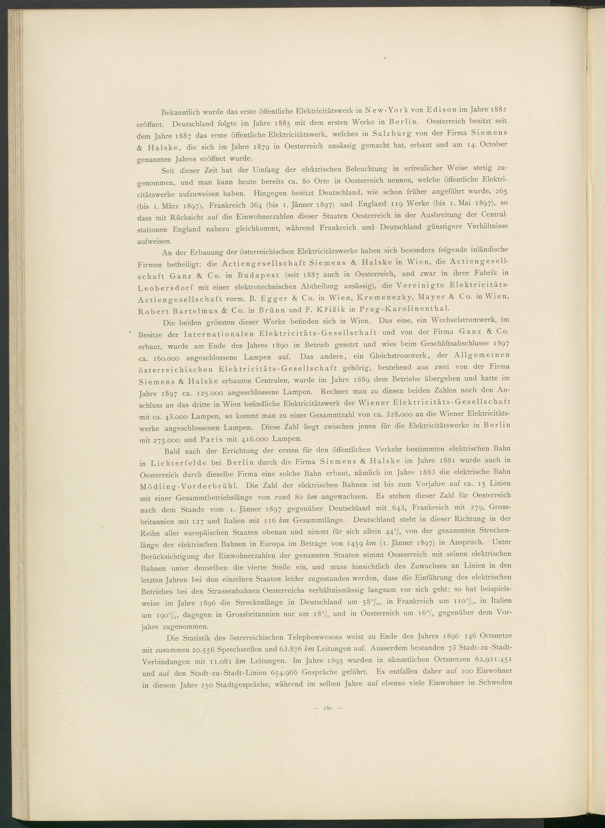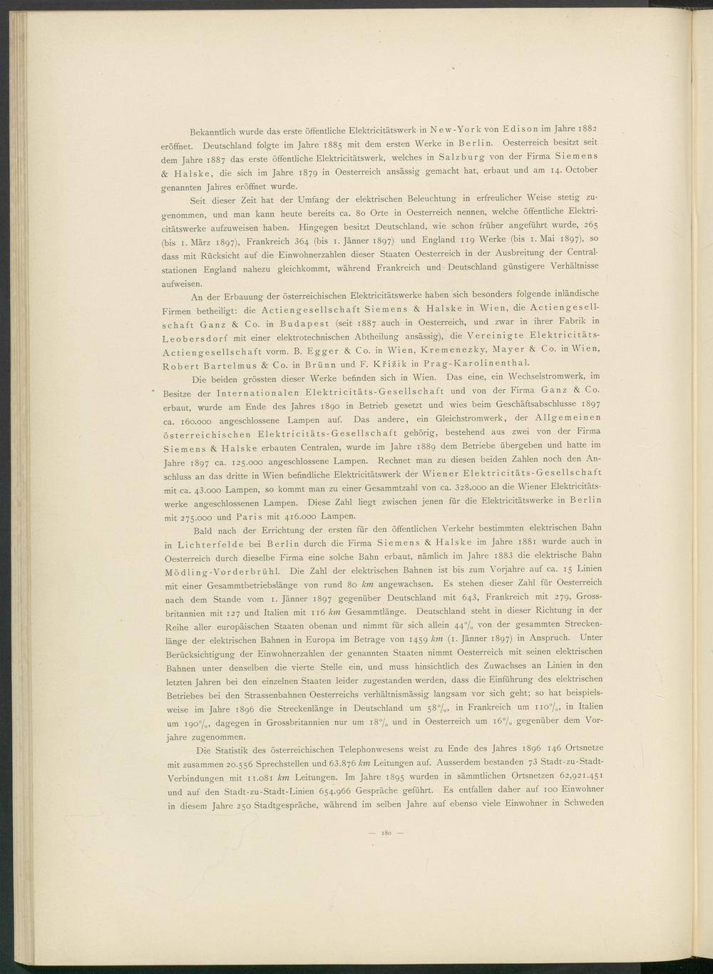 An der Erbauung der österreichischen Elektricitätswerke haben sich besonders folgende inländische Firmen betheiligt: die Actiengesellschaft Siemens & Halske in Wien, die Actiengesell- schaft Ganz & Co. in Budapest (seit 1887 auch in Oesterreich, und zwar in ihrer Fabrik in Leobersdorf mit einer elektrotechnischen Abtheilung ansässig), die Vereinigte Elektricitäts- Actiengesellschaft vorm. B. Egger & Co. in Wien, Kremenezky, Mayer & Co. in Wien, Robert Bartelmus & Co. in Brünn und F. Krizik in Prag-Karolinenthal.