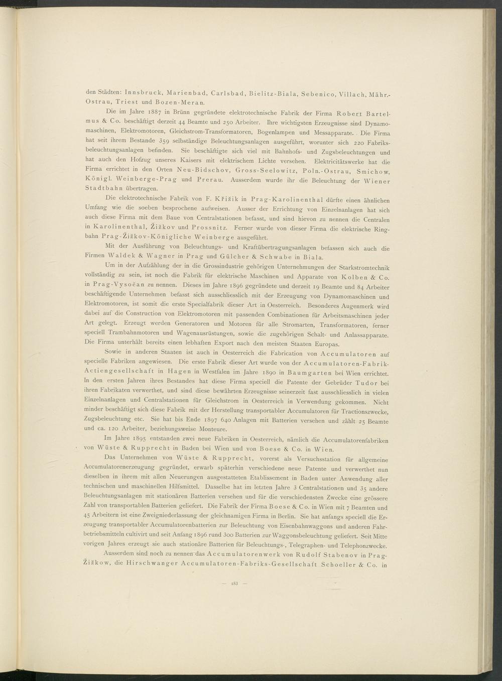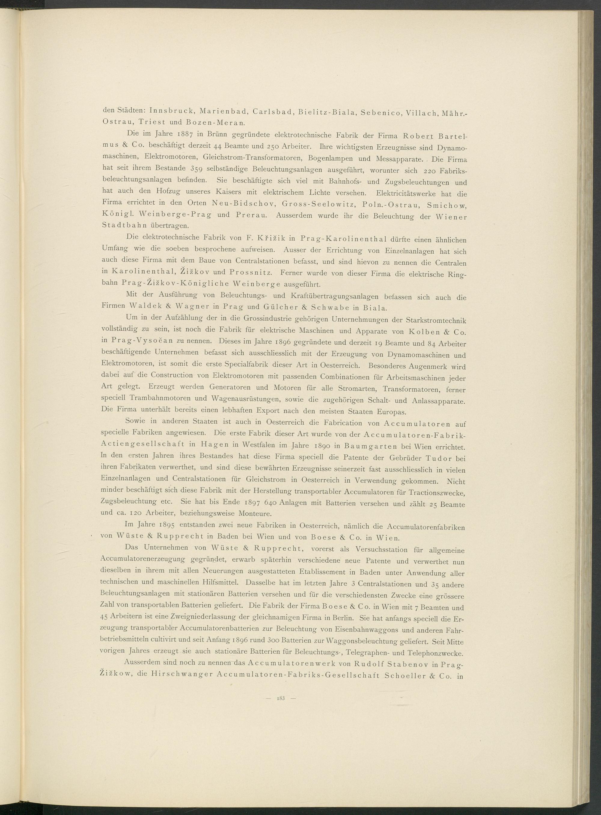 Das Unternehmen von Wüste & Rupprecht, vorerst als Versuchsstation für allgemeine Accumulatorenerzeugung gegründet, erwarb späterhin verschiedene neue Patente und verwerthet nun dieselben in ihrem mit allen Neuerungen ausgestatteten Etablissement in Baden unter Anwendung aller technischen und maschinellen Hilfsmittel. Dasselbe hat im letzten Jahre 3 Centralstationen und 35 andere Beleuchtungsanlagen mit stationären Batterien versehen und für die verschiedensten Zwecke eine grössere Zahl von transportablen Batterien geliefert. Die Fabrik der Firma Boese & Co. in Wien mit 7 Beamten und 45 Arbeitern ist eine Zweigniederlassung der gleichnamigen Firma in Berlin. Sie hat anfangs speciell die Erzeugung transportabler Accumulatorenbatterien zur Beleuchtung von Eisenbahnwaggons und anderen Fahrbetriebsmitteln cultivirt und seit Anfang 1896 rund 3oo Batterien zur Waggonsbeleuchtung geliefert. Seit Mitte vorigen Jahres erzeugt sie auch stationäre Batterien für Beleuchtungs-, Telegraphen- und Telephonzwecke.