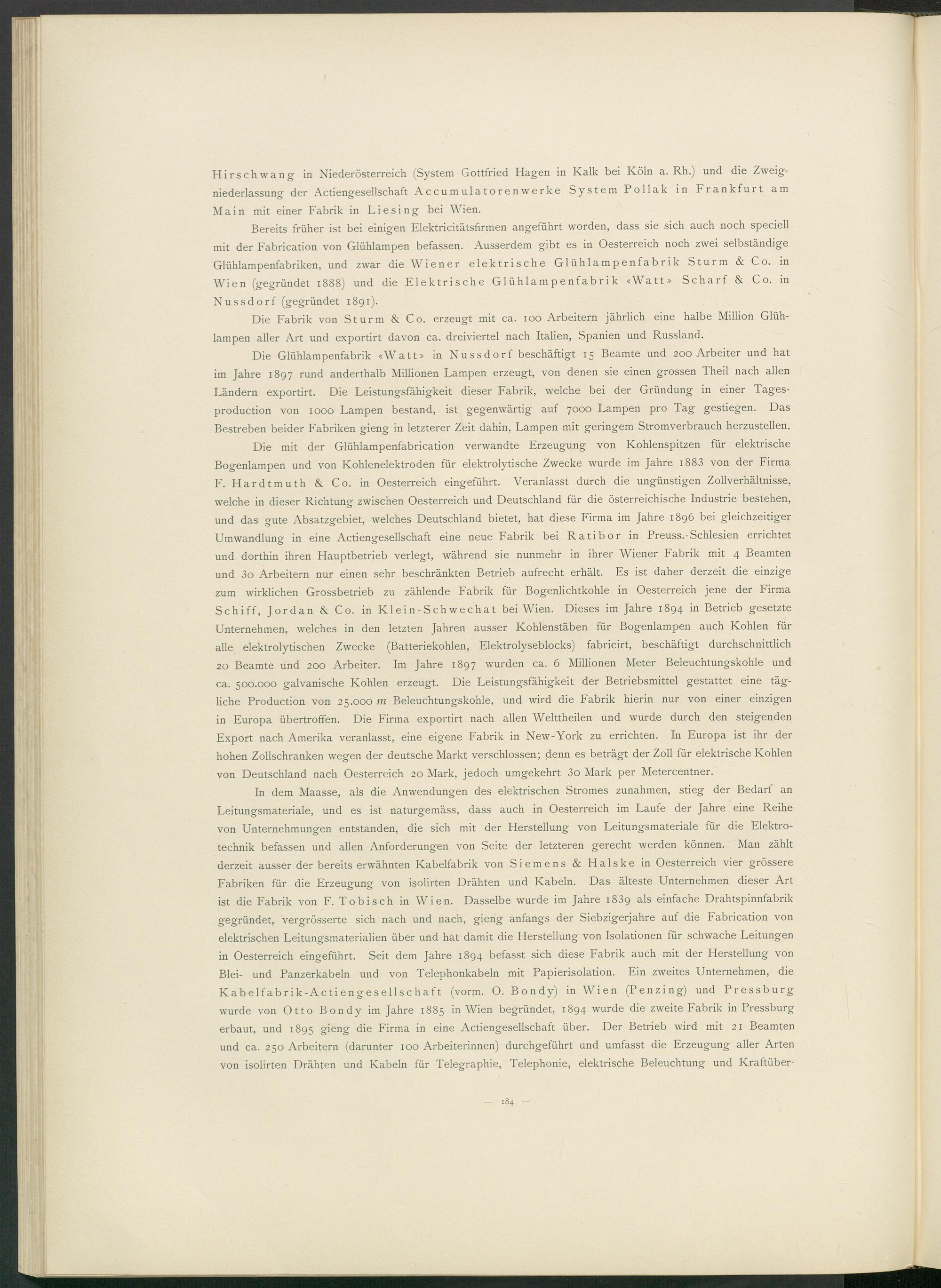 Bereits früher ist bei einigen Elektricitätsfirmen angeführt worden, dass sie sich auch noch speciell mit der Fabrication von Glühlampen befassen. Ausserdem gibt es in Oesterreich noch zwei selbständige Glühlampenfabriken, und zwar die Wiener elektrische Glühlampenfabrik Sturm & Co. in Wien (gegründet 1888) und die Elektrische Glühlampenfabrik «Watt» Scharf & Co. in Nussdorf (gegründet 1891).