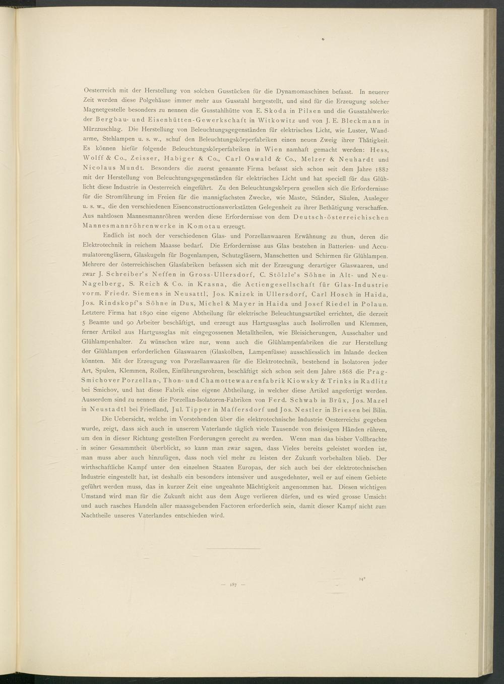Endlich ist noch der verschiedenen Glas- und Porzellanwaaren Erwähnung zu thun, deren die Elektrotechnik in reichem Maasse bedarf. Die Erfordernisse aus Glas bestehen in Batterien- und Accu- mulatorengläsern, Glaskugeln für Bogenlampen, Schutzgläsern, Manschetten und Schirmen für Glühlampen. Mehrere der österreichischen Glasfabriken befassen sich mit der Erzeugung derartiger Glaswaaren, und zwar J. Schreiber’s Neffen in Gross-Ullersdorf, C. Stölzle’s Söhne in Alt- und Neu- Nagelberg, S. Reijch & Co. in Krasna, die Actiengesellschaft für Glas-Industrie vorm. Friedr. Siemens in Neusattl, Jos. Knizek in Ullersdorf, Carl Hosch in Haida, Jos. Rindskopf’s Söhne in Dux, Michel & Mayer in Haida und Josef Riedel in Polaun. Letztere Firma hat 1890 eine eigene Abtheilung für elektrische Beleuchtungsartikel errichtet, die derzeit 5 Beamte und 90 Arbeiter beschäftigt, und erzeugt aus Hartgussglas auch Isolirrollen und Klemmen, ferner Artikel aus Hartgussglas mit eingegossenen Metalltheilen, wie Bleisicherungen, Ausschalter und Glühlampenhalter. Zu wünschen wäre nur, wenn auch die Glühlampenfabriken die zur Herstellung der Glühlampen erforderlichen Glaswaaren (Glaskolben, Lampenfüsse) ausschliesslich im Inlande decken könnten. Mit der Erzeugung von Porzellanwaaren für die Elektrotechnik, bestehend in Isolatoren jeder Art, Spulen, Klemmen, Rollen, Einführungsrohren, beschäftigt sich schon seit dem Jahre 1868 die Prag- Smichover Porzellan-, Thon- und Chamottewaarenfabrik Kiowsky & Trinks in Radlitz bei Smichov, und hat diese Fabrik eine eigene Abtheilung, in welcher diese Artikel angefertigt werden. Ausserdem sind zu nennen die Porzellan-Isolatoren-Fabriken von Ferd. Schwab in Brüx, Jos. Mazel in Neustadtl bei Friedland, Jul. Tipper in Maffersdorf und Jos. Nestler in Briesen bei Bilin.