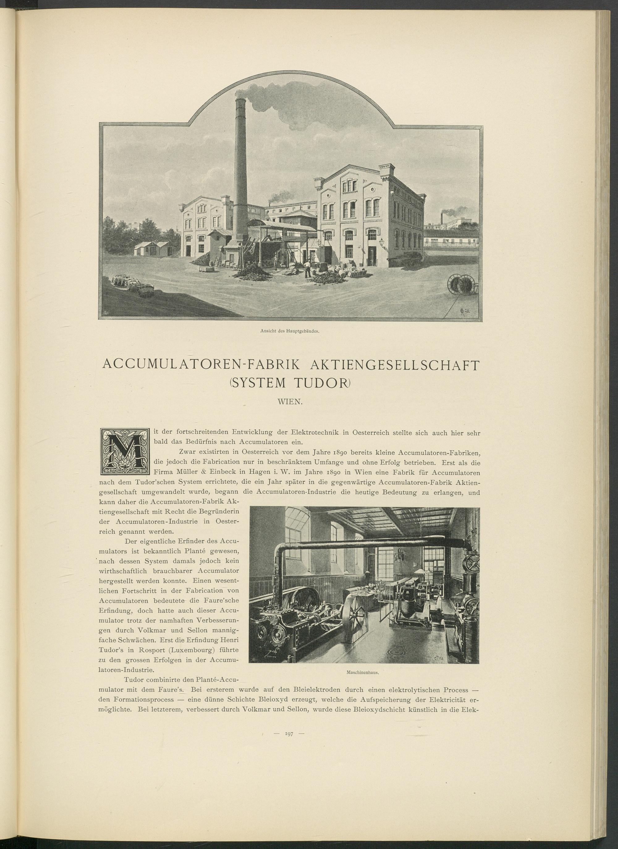 Zwar existirten in Oesterreich vor dem Jahre 1890 bereits kleine Accumulatoren-Fabriken, die jedoch die Fabrication nur in beschränktem Umfange und ohne Erfolg betrieben. Erst als die Firma Müller & Einbeck in Hagen i. W. im Jahre 1890 in Wien eine Fabrik für Accumulatoren nach dem Tudor’schen System errichtete, die ein Jahr später in die gegenwärtige Accumulator en-Fabrik Aktiengesellschaft umgewandelt wurde, begann die Accumulatoren-Industrie die heutige Bedeutung zu erlangen, und kann daher die Accumulatoren-Fabrik Aktiengesellschaft mit Recht die Begründerin der Accumulatoren-Industrie in Oesterreich genannt werden.