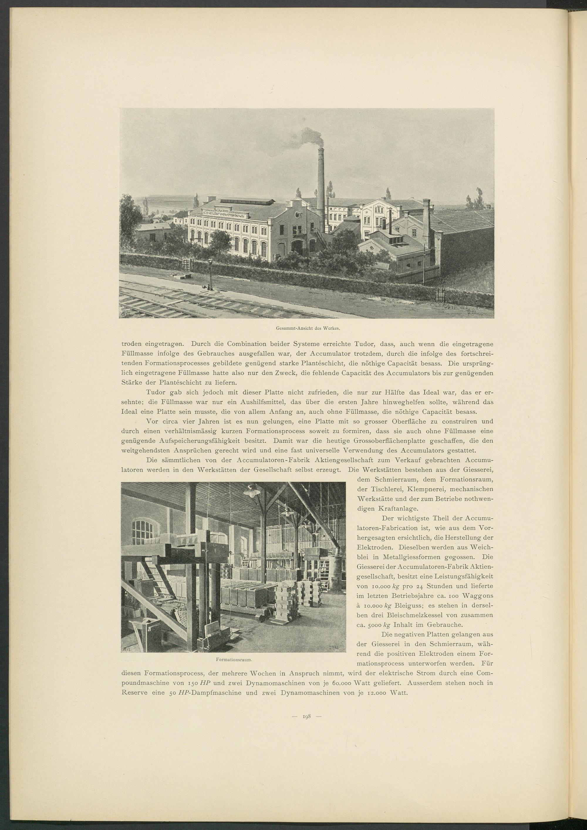 Die negativen Platten gelangen aus der Giesserei in den Schmierraum, während die positiven Elektroden einem Formationsprocess unterworfen werden. Für diesen Formationsprocess, der mehrere Wochen in Anspruch nimmt, wird der elektrische Strom durch eine Compoundmaschine von 150 HP und zwei Dynamomaschinen von je 60.000 AVatt geliefert. Ausserdem stehen noch in Reserve eine 50 /ZP-Dampfmaschine und zwei Dynamomaschinen von je 12.000 AVatt.