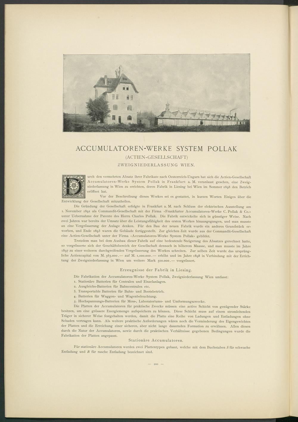 urch den vermehrten Absatz ihrer Fabrikate nach Oesterreich-Ungarn hat sich die Actien-Gesellschaft Accumulatoren-Werke System Pollak in Frankfurt a. M. veranlasst gesehen, eine Zweigniederlassung in Wien zu errichten, deren Fabrik in Liesing bei Wien im Sommer 1898 den Betrieb eröffnet hat.