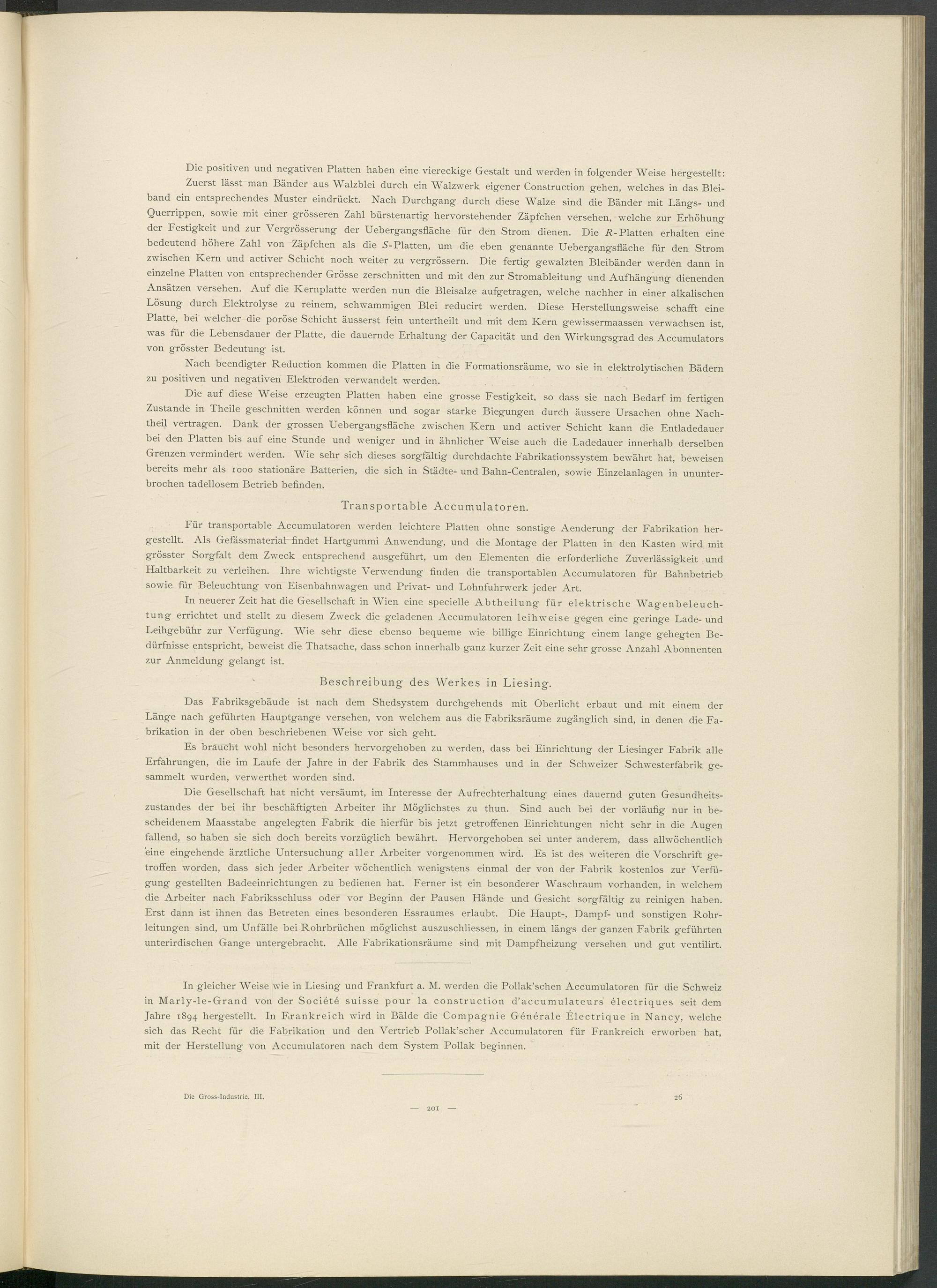 In gleicher Weise wie in Liesing und Frankfurt a. M. werden die Pollak’schen Accumulatoren für die Schweiz in Marly-le-Grand von der Société suisse pour la construction d’accumulateurs électriques seit dem Jahre 1894 hergestellt. In Frankreich wird in Bälde die Compagnie Générale Électrique in Nancy, welche sich das Recht für die Fabrikation und den Vertrieb Pollak’scher Accumulatoren für Frankreich erworben hat, mit der Herstellung von Accumulatoren nach dem System Pollak beginnen.
