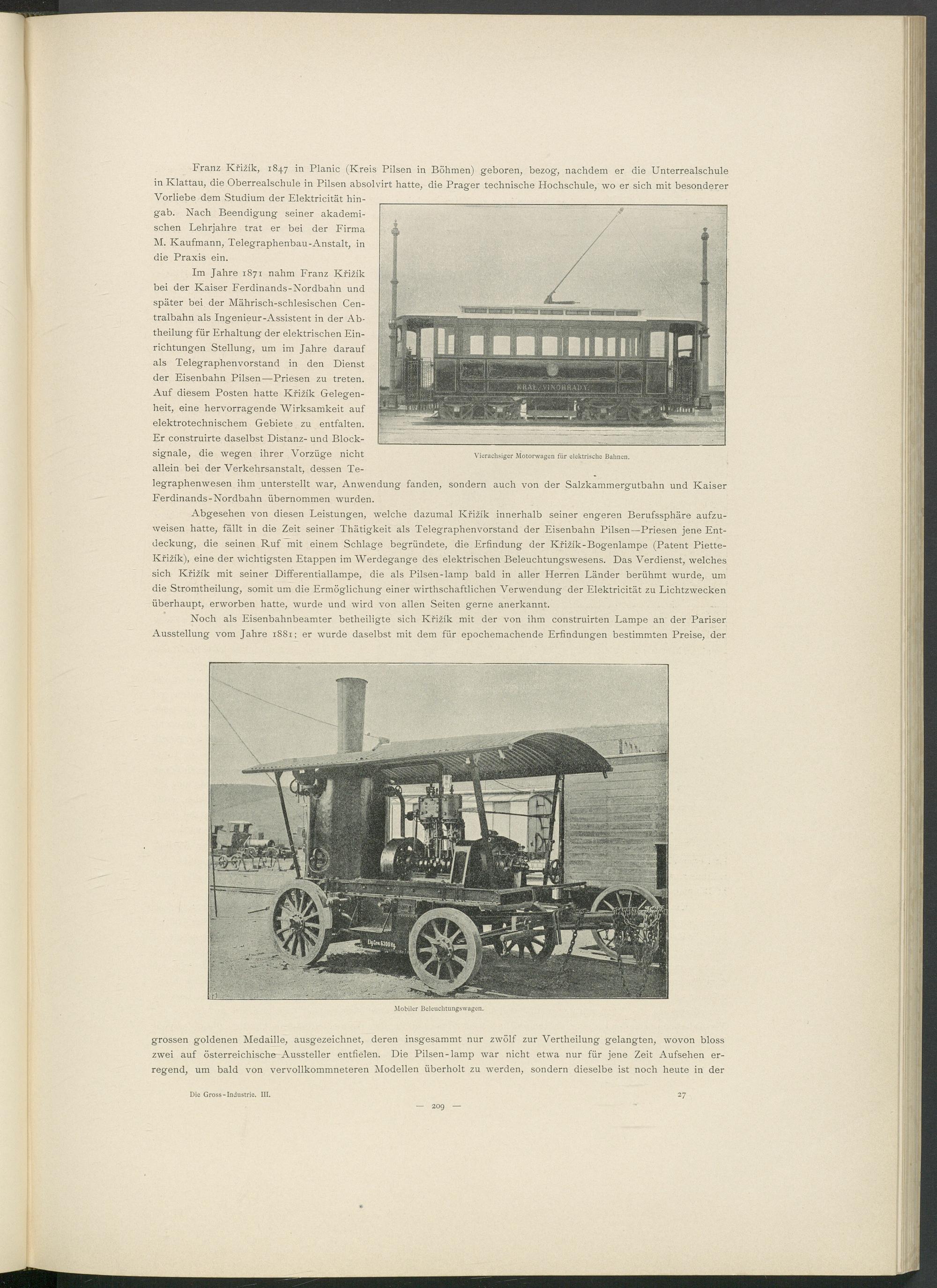Franz Krizik, 1847 in Planic (Kreis Pilsen in Böhmen) geboren, bezog, nachdem er die Unterrealschule in Klattau, die Oberrealschule in Pilsen absolvirt hatte, die Prager technische Hochschule, wo er sich mit besonderer Vorliebe dem Studium der Elektricität hingab. Nach Beendigung seiner akademischen Lehrjahre trat er bei der Firma M. Kaufmann, Telegraphenbau-Anstalt, in die Praxis ein.