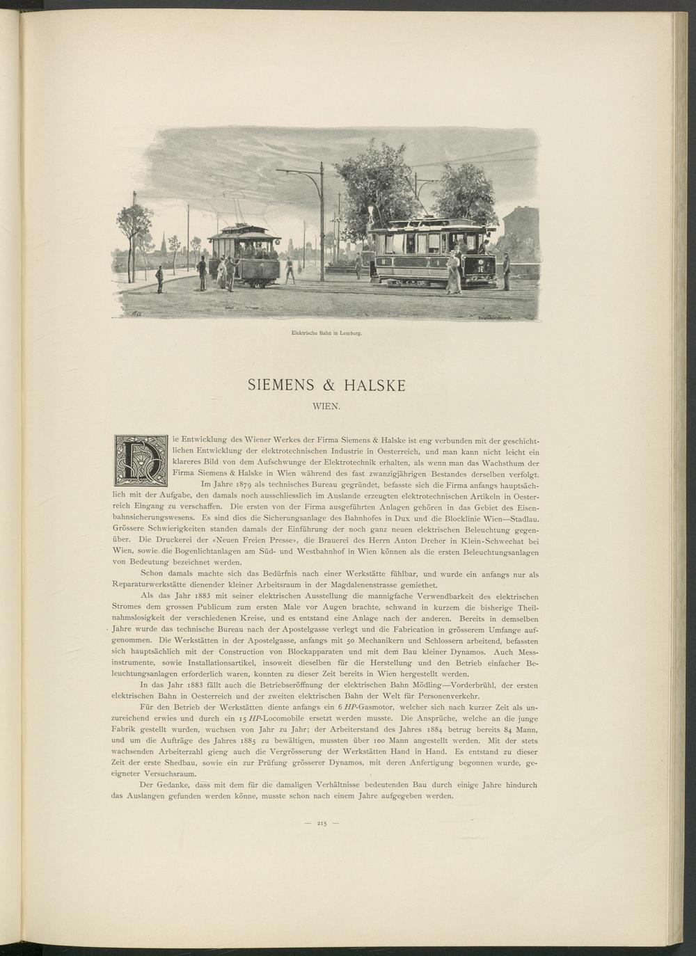 ie Entwicklung des Wiener Werkes der Firma Siemens & Halske ist eng verbunden mit der geschichtlichen Entwicklung der elektrotechnischen Industrie in Oesterreich, und man kann nicht leicht ein klareres Bild von dem Aufschwünge der Elektrotechnik erhalten, als wenn man das Wachsthum der Firma Siemens & Halske in Wien während des fast zwanzigjährigen Bestandes derselben verfolgt. Im Jahre 187g als technisches Bureau gegründet, befasste sich die Firma anfangs hauptsächlich mit der Aufgabe, den damals noch ausschliesslich im Auslande erzeugten elektrotechnischen Artikeln in Oesterreich Eingang zu verschaffen. Die ersten von der Firma ausgeführten Anlagen gehören in das Gebiet des Eisenbahnsicherungswesens. Es sind dies die Sicherungsanlage des Bahnhofes in Dux und die Blocklinie Wien—Stadlau. Grössere Schwierigkeiten standen damals der Einführung der noch ganz neuen elektrischen Beleuchtung gegenüber. Die Druckerei der «Neuen Freien Presse», die Brauerei des Herrn Anton Dreher in Klein-Schwechat bei Wien, sowie die Bogenlichtanlagen am Süd- und Westbahnhof in Wien können als die ersten Beleuchtungsanlagen von Bedeutung bezeichnet werden.
