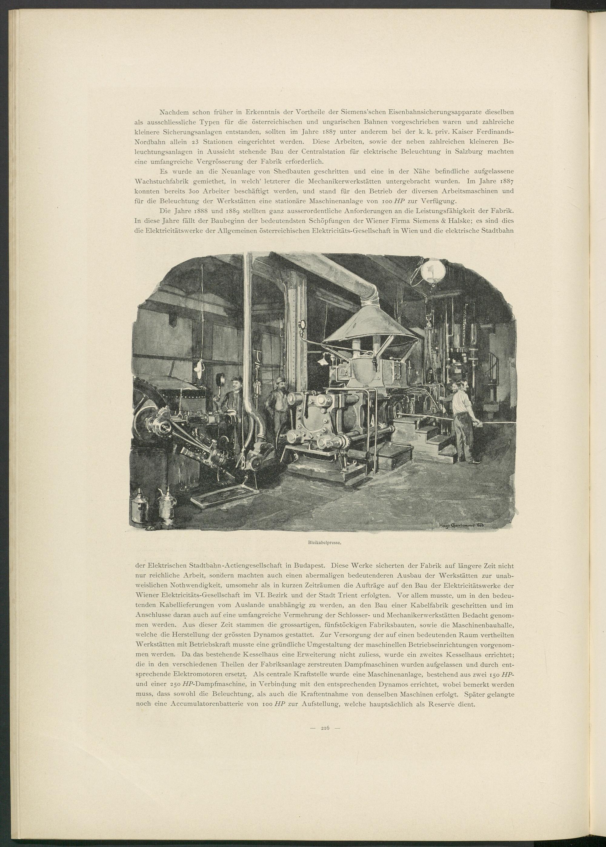 der Elektrischen Stadtbahn-Actiengesellschaft in Budapest. Diese Werke sicherten der Fabrik auf längere Zeit nicht nur reichliche Arbeit, sondern machten auch einen abermaligen bedeutenderen Ausbau der Werkstätten zur unab- weislichen Nothwendigkeit, umsomehr als in kurzen Zeiträumen die Aufträge auf den Bau der Elektricitätswerke der Wiener Elektricitäts-Gesellschaft im VI. Bezirk und der Stadt Trient erfolgten. Vor allem musste, um in den bedeutenden Kabellieferungen vom Auslande unabhängig zu werden, an den Bau einer Kabelfabrik geschritten und im Anschlüsse daran auch auf eine umfangreiche Vermehrung der Schlosser- und Mechanikerwerkstätten Bedacht genommen werden. Aus dieser Zeit stammen die grossartigen, fünfstöckigen Fabriksbauten, sowie die Maschinenbauhalle, welche die Herstellung der grössten Dynamos gestattet. Zur Versorgung der auf einen bedeutenden Raum vertheilten Werkstätten mit Betriebskraft musste eine gründliche Umgestaltung der maschinellen Betriebseinrichtungen vorgenommen werden. Da das bestehende Kesselhaus eine Erweiterung nicht zuliess, wurde ein zweites Kesselhaus errichtet; die in den verschiedenen Theilen der Fabriksanlage zerstreuten Dampfmaschinen wurden aufgelassen und durch entsprechende Elektromotoren ersetzt. Als centrale Kraftstelle wurde eine Maschinenanlage, bestehend aus zwei 150 HP- und einer 250 ÄP-Dampfmaschine, in Verbindung mit den entsprechenden Dynamos errichtet, wobei bemerkt werden muss, dass sowohl die Beleuchtung, als auch die Kraftentnahme von denselben Maschinen erfolgt. Später gelangte noch eine Accumulatorenbatterie von 100 HP zur Aufstellung, welche hauptsächlich als Reserve dient.