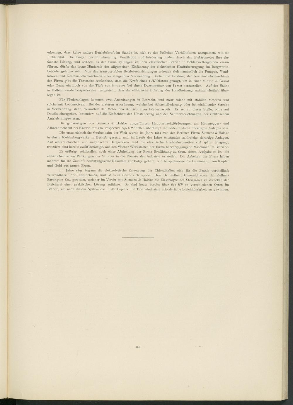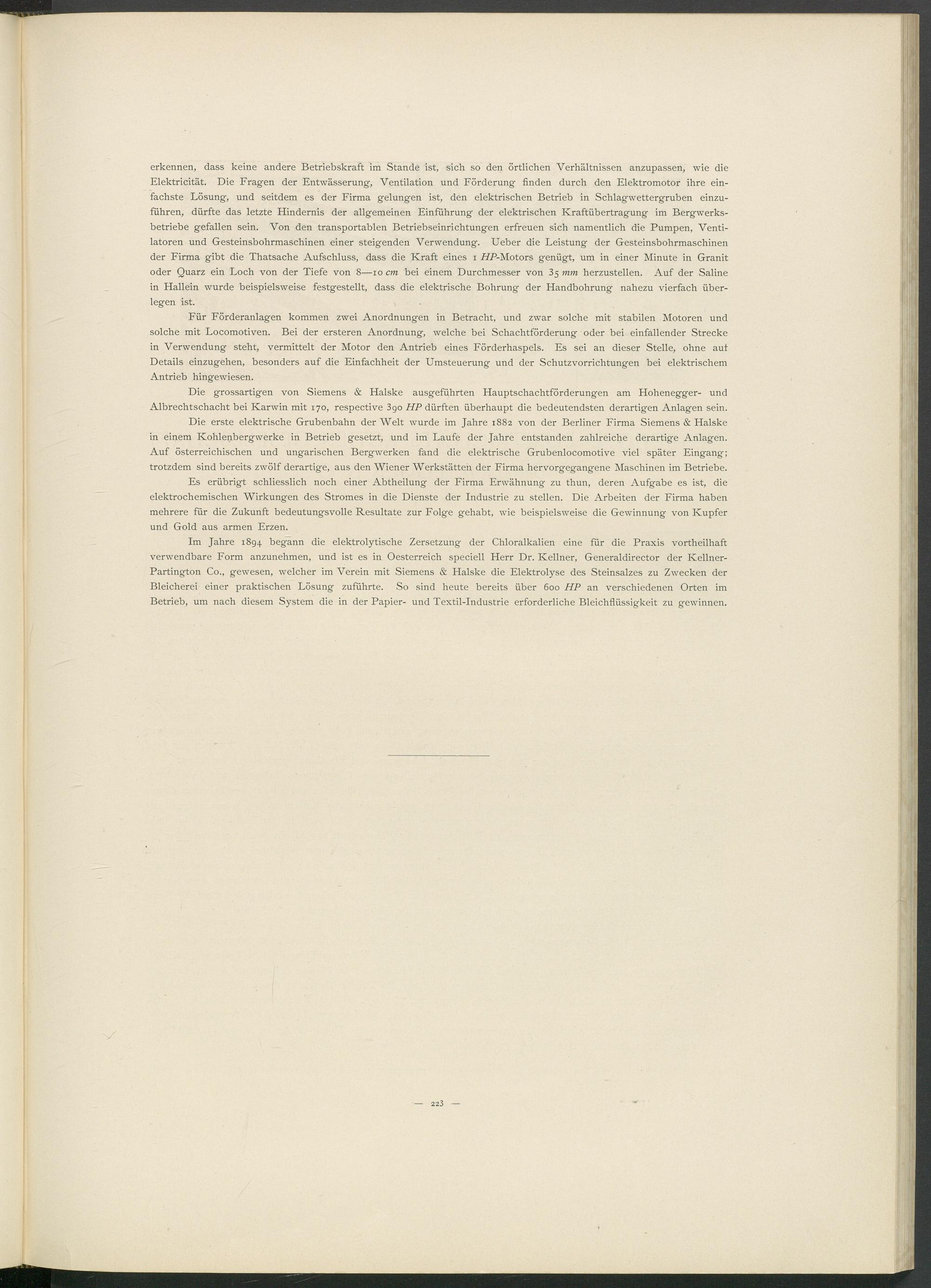 Im Jahre 1894 begann die elektrolytische Zersetzung der Chloralkalien eine für die Praxis vortheilhaft verwendbare Form anzunehmen, und ist es in Oesterreich speciell Herr Dr. Kellner, Generaldirector der Kellner- Partington Co., gewesen, welcher im Verein mit Siemens & Halske die Elektrolyse des Steinsalzes zu Zwecken der Bleicherei einer praktischen Lösung zuführte. So sind heute bereits über 600 HP an verschiedenen Orten im Betrieb, um nach diesem System die in der Papier- und Textil-Industrie erforderliche Bleichflüssigkeit zu gewinnen.
