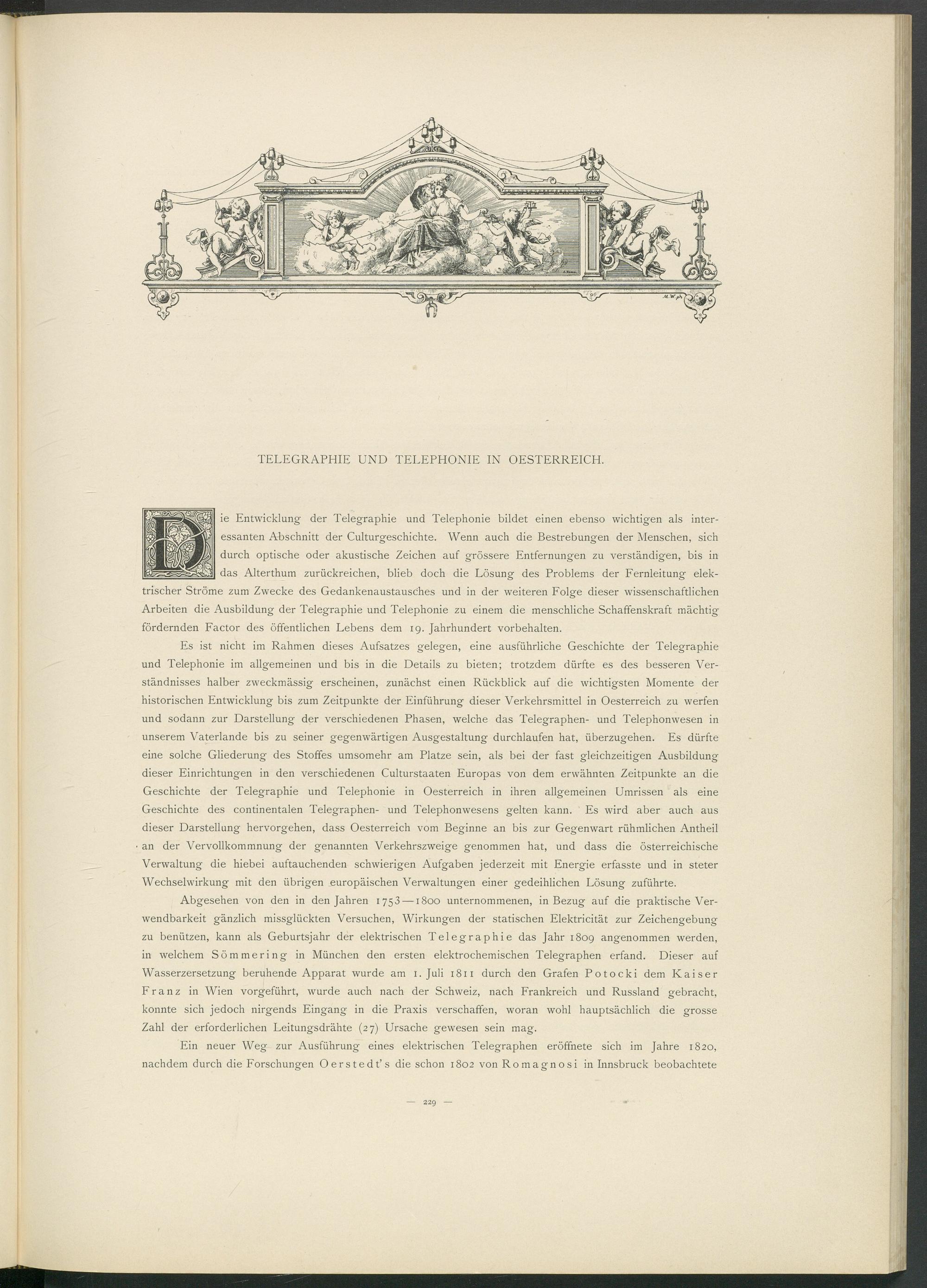 ie Entwicklung der Telegraphie und Telephonie bildet einen ebenso wichtigen als interessanten Abschnitt der Culturgeschichte. Wenn auch die Bestrebungen der Menschen, sich durch optische oder akustische Zeichen auf grössere Entfernungen zu verständigen, bis in das Alterthum zurückreichen, blieb doch die Lösung des Problems der Fernleitung elektrischer Ströme zum Zwecke des Gedankenaustausches und in der weiteren Folge dieser wissenschaftlichen Arbeiten die Ausbildung der Telegraphie und Telephonie zu einem die menschliche Schaffenskraft mächtig fördernden Factor des öffentlichen Lebens dem 19. Jahrhundert Vorbehalten.